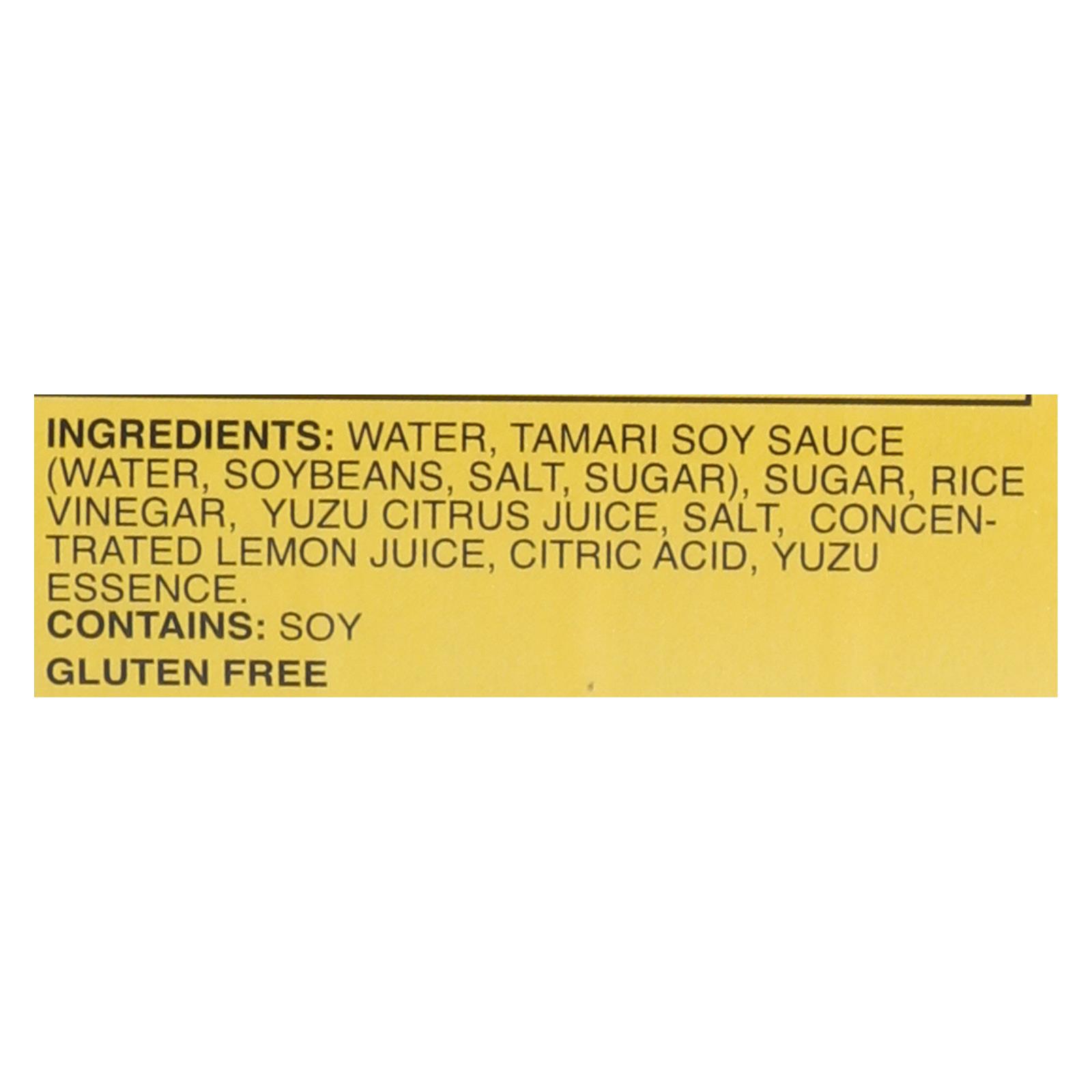 Water, tamari soy sauce (soybeans, salt), sugar, rice vinegar, yuzu citrus juice, concentrated lemon juice, citric acid, yuzu essence.