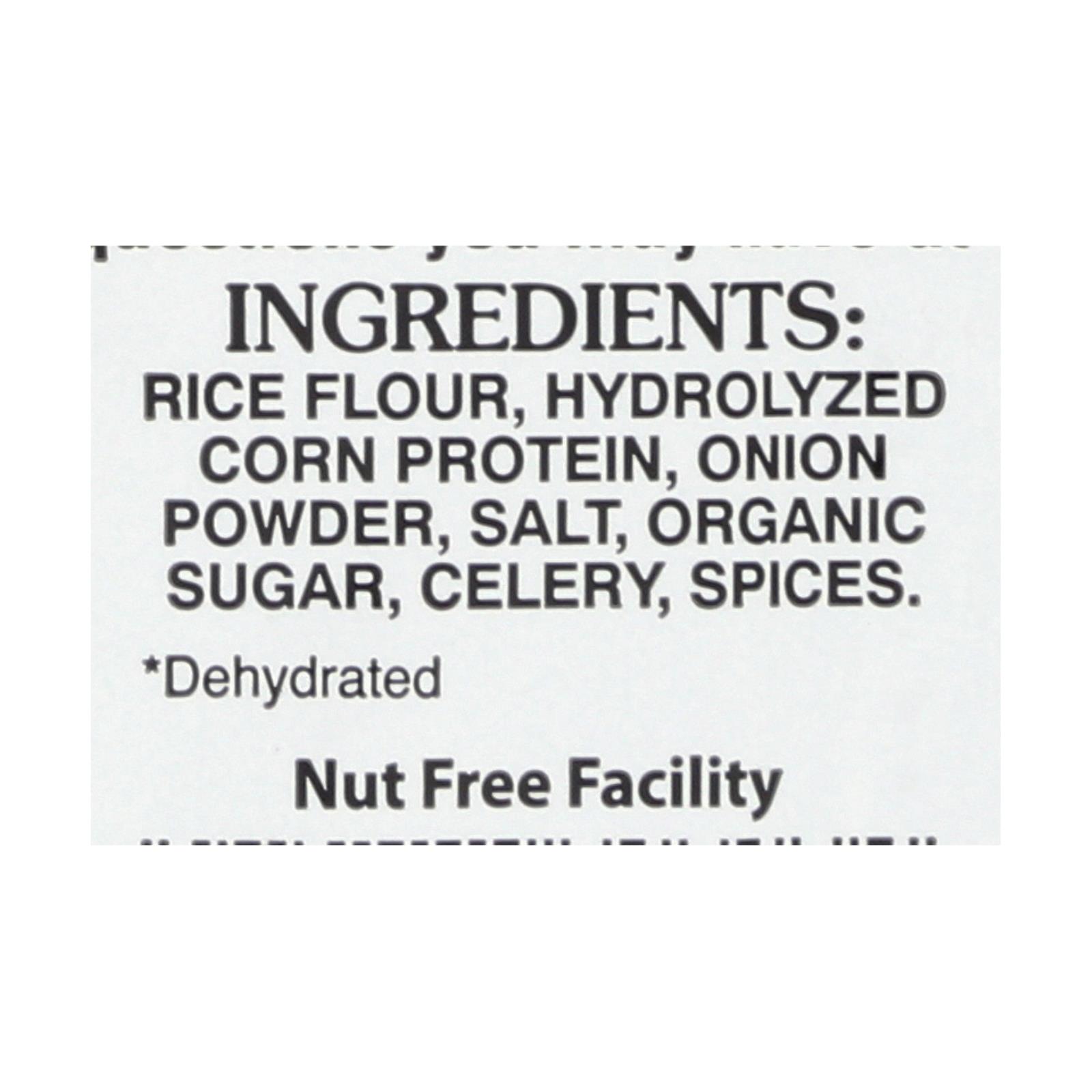 Rice flour, hydrolyzed corn protein, onion powder, salt, organic sugar, celery, spices.