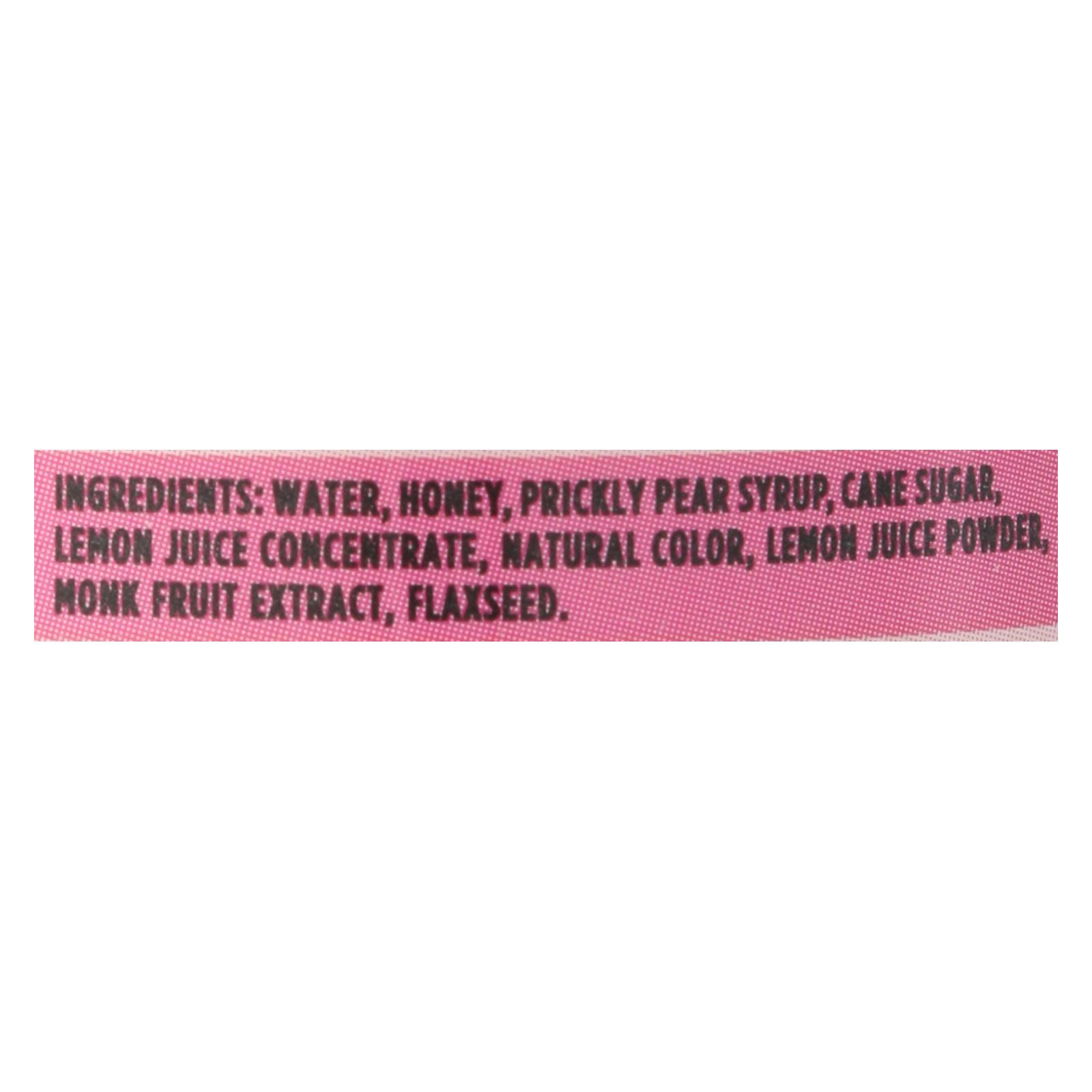 Water, honey, prickly pear syrup, cane sugar, lemon juice concentrate, natural color, lemon juice powder, monk fruit extract, flaxseed.
