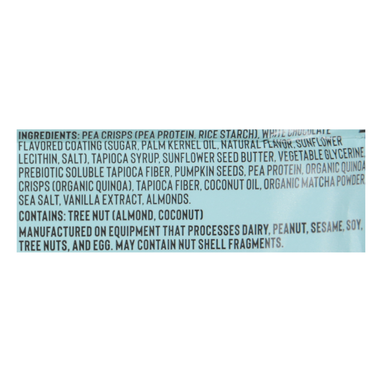 Pea crisp (pea protein, rice starch); tapioca syrup; white coating (sugar, palm kernel oil, natural flavor, sunflower lecithin (an emulsifier), salt); roasted sunflower seed; chicory root fiber; organic vegetable glycerin; hydrolyzed pea protein; organic quinoa; pumpkin seeds; amaranth; organic matcha powder (organic green tea); Himalayan pink salt; sunflower lecithin; vanilla extract
