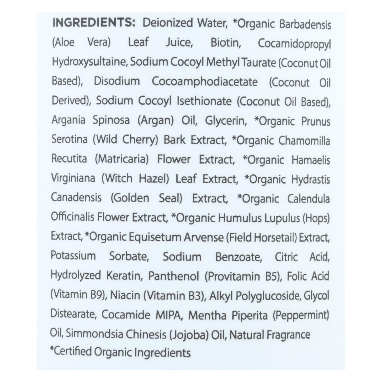 ingredients : deionized water;organic barbadensis;aloe vera;leaf juice;biotin;cocamidopropyl hydroxysultaine;sodium cocoyl methyl taurate;coconut oil based;disodium cocoamphodiacetate;coconut oil derived;sodium cocoyl isethionate;argania spinosa;argan;oil;glycerin;organic prunus serotina;wild cherry;bark extract;organic chamomilla recutita;matricaria;flower extract;organic hamaelis virginiana;witch hazel;leaf tract;organic hydrastis canadensis;golden seal;extract;organic calendula officinalis flower extract;