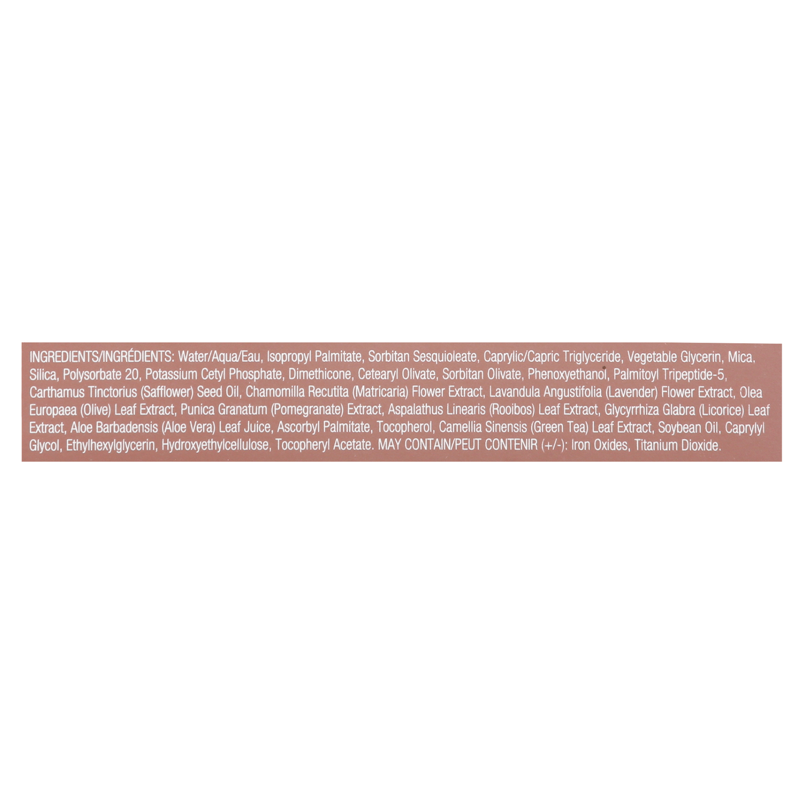 Water/aqua/eau, isopropyl palmitate, sorbitan sesquioleate, caprylic/capric triglyceride, vegetable glycerin, mica, silica, polysorbate 20, potassium cetyl phosphate, dimethicone, cetearyl olivate, sorbitan olivate, phenoxyethanol, palmitoyl tripeptide-5, carthamus tinctorius (safflower) seed oil, chamomilla recutita (matricaria) flower extract, lavandula angustifolia (lavender) flower extract, olea europaea (olive) leaf extract, punica granatum (pomegranate) extract, aspalathus linearis (rooibos) leaf extract, gly.