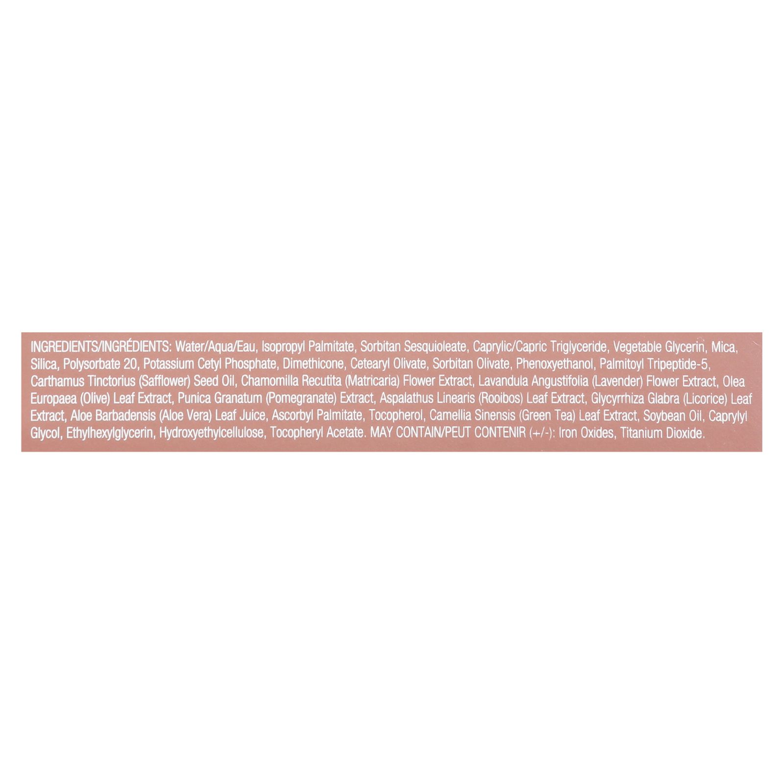 ingredients : water/aqua/eau;isopropyl palmitate;sorbitan sesquioleate;caprylic/capric triglyceride;vegetable glycerin;mica;silica;polysorbate 20;potassium cetyl phosphate;dimethicone;cetearyl olivate;sorbitan olivate;phenoxyethanol;palmitoyl tripeptide-5;carthamus tinctorius (safflower) seed oil;chamomilla recutita (matricaria) flower extract;lavandula angustifolia (lavender) flower extract;olea europaea (olive) leaf extract;punica granatum (pomegranate) extract;aspalathus linearis (rooibos) leaf extract;gly