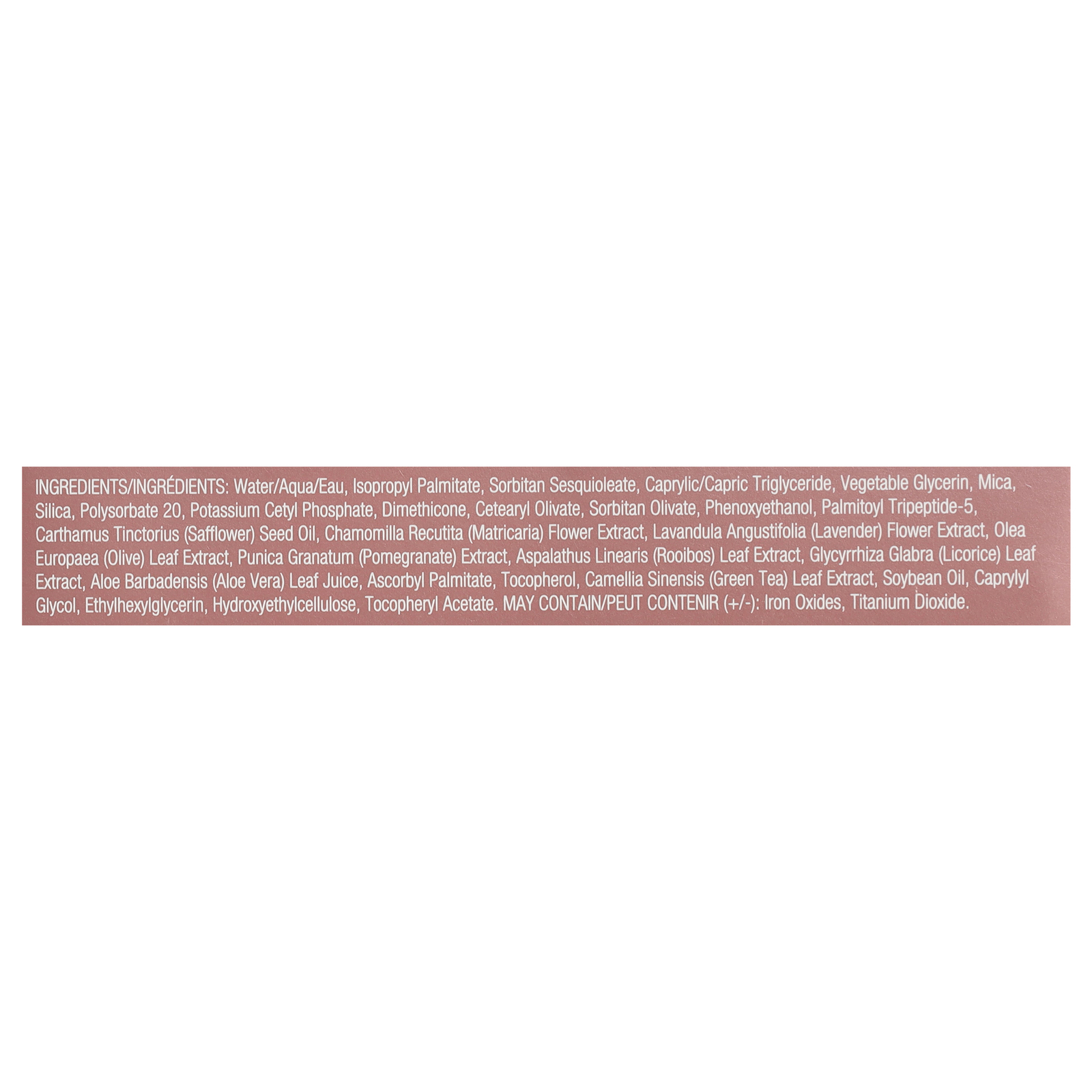 Water/aqua/eau, isopropyl palmitate, sorbitan sesquioleate, caprylic/capric triglyceride, vegetable glycerin, mica, silica, polysorbate 20, potassium cetyl phosphate, dimethicone, cetearyl olivate, sorbitan olivate, phenoxyethanol, palmitoyl tripeptide-5, carthamus tinctorius (safflower) seed oil, chamomilla recutita (matricaria) flower extract, lavandula angustifolia (lavender) flower extract, olea europaea (olive) leaf extract, punica granatum (pomegranate) extract, aspalathus linearis (rooibos) leaf extract, gly.