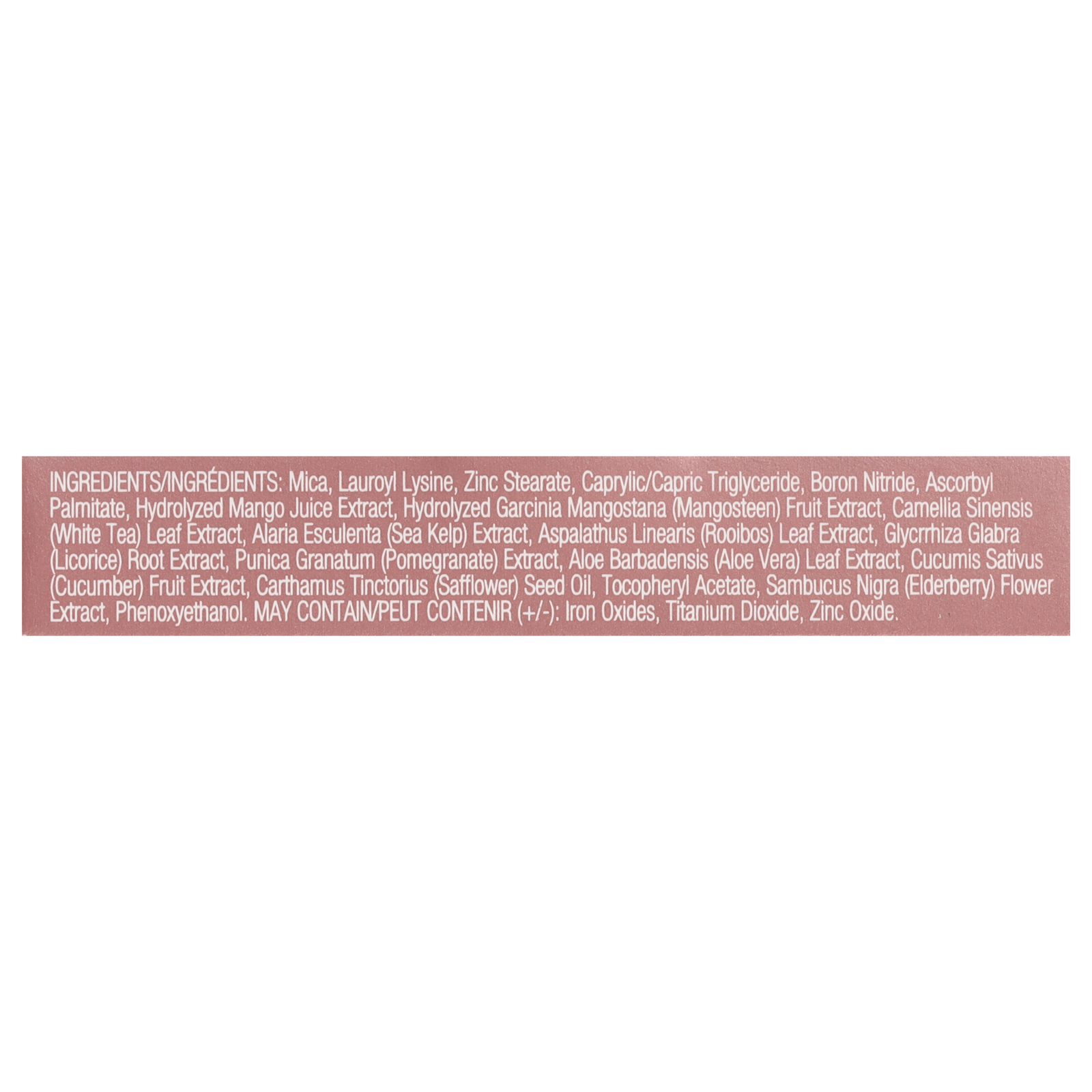 mica, lauroyl lysine, zinc stearate, caprylic/capric triglyceride, boron nitride, ascorbyl palmitate, hydrolyzed mango juice extract, hydrolyzed garcinia mangostana (mangosteen) fruit extract, camellia sinensis (white tea) leaf extract, alaria esculenta (sea kelp) extract, aspalathus linearis (rooibos) leaf extract, glycyrrhiza glabra (licorice) root extract, punica granatum (pomegranate) extract, aloe barbadensis (aloe vera) leaf extract, cucumis sativus (cucumber) fruit extract, carthamus tinctorius (safflower).