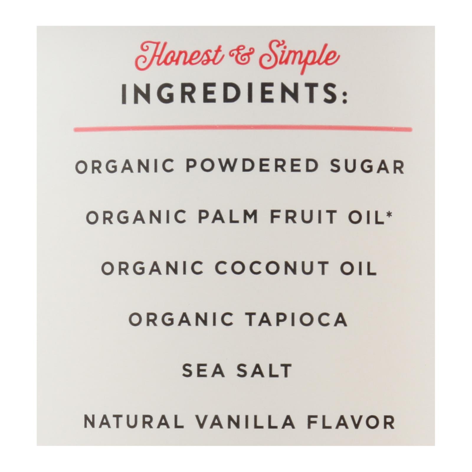 ingredients : organic powdered sugar organic palm fruit oil* organic coconut oil organic tapioca sea salt natural vanilla flavor