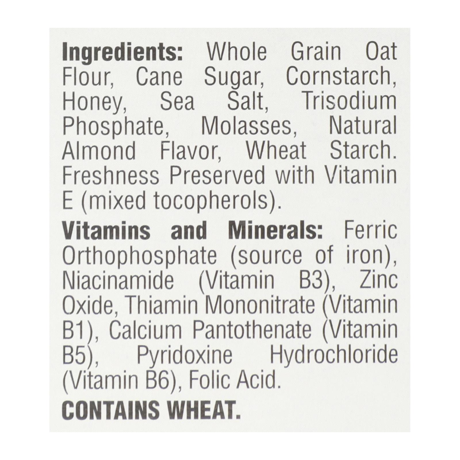 Ferric orthophosphate (source of iron), niacinamide (vitamin B3), zinc oxide, thiamin mononitrate (vitamin B1), calcium pantothenate (vitamin B5), pyridoxine hydrochloride (vitamin B6), folic acid, whole grain oat flour, cane sugar, cornstarch, honey, sea salt, trisodium phosphate, molasses, natural almond flavor, wheat starch, freshness preserved with vitamin E (mixed tocopherols).