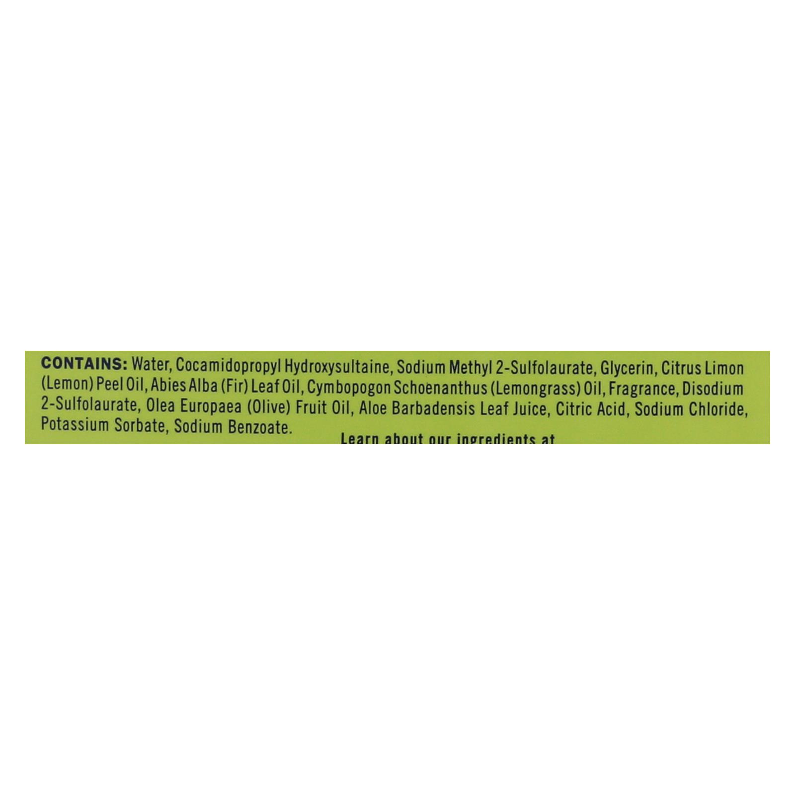 Water, cocamidopropyl hydroxysultaine, sodium methyl 2-sulfolaurate, glycerin, citrus limon (lemon) peel oil, abies alba (fir) leaf oil, cymbopogon schoenanthus (lemongrass) oil, fragrance, disodium 2-sulfolaurate, olea europaea (olive) fruit oil, aloe barbadensis leaf juice, citric acid, sodium chloride, potassium sorbate, sodium benzoate.