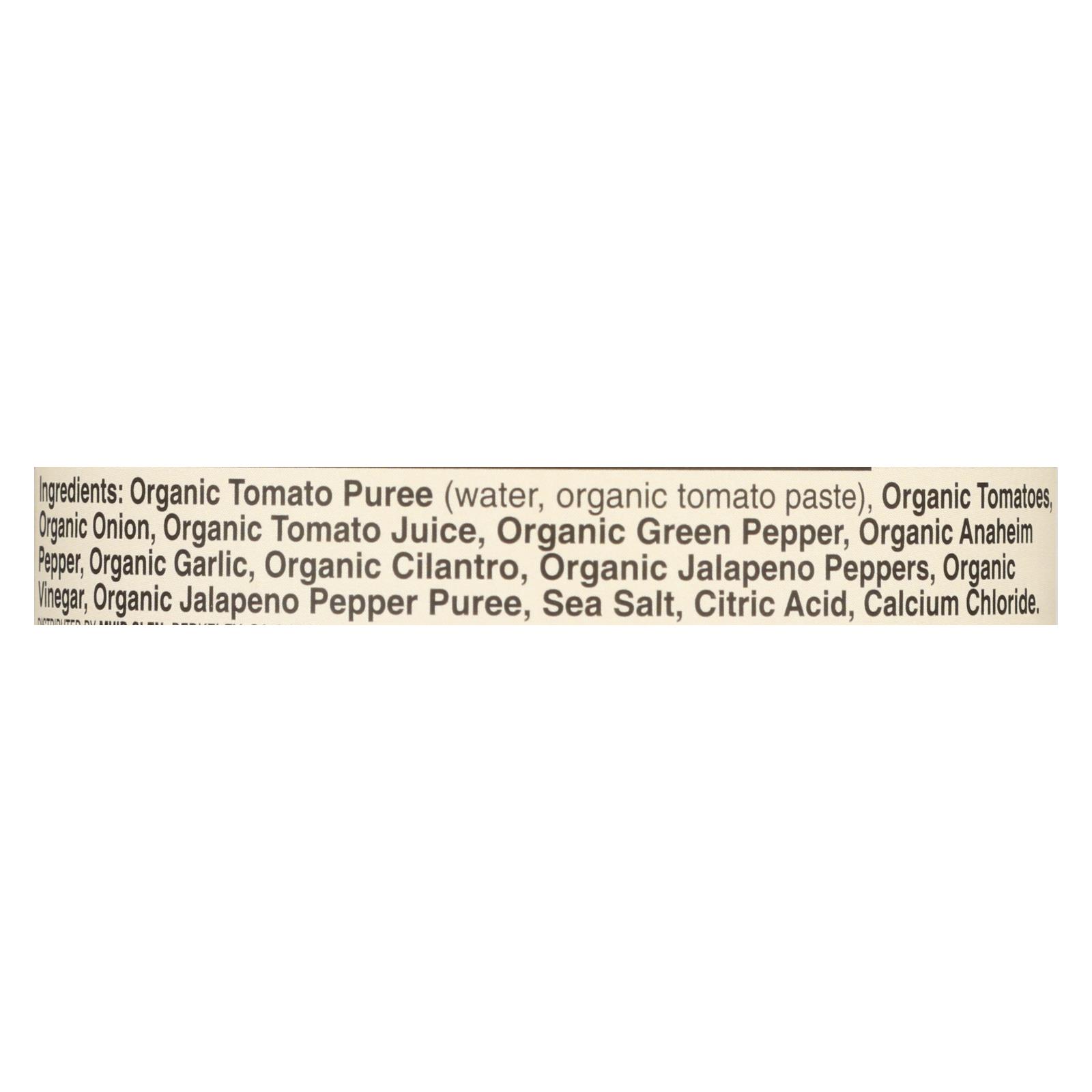 Organic tomato puree (water, organic tomato paste), organic tomatoes, organic onion, organic tomato juice, organic green pepper, organic anaheim pepper, organic garlic, organic cilantro, organic jalapeno peppers, organic vinegar, organic jalapeno pepper puree, sea salt, citric acid, calcium chloride.