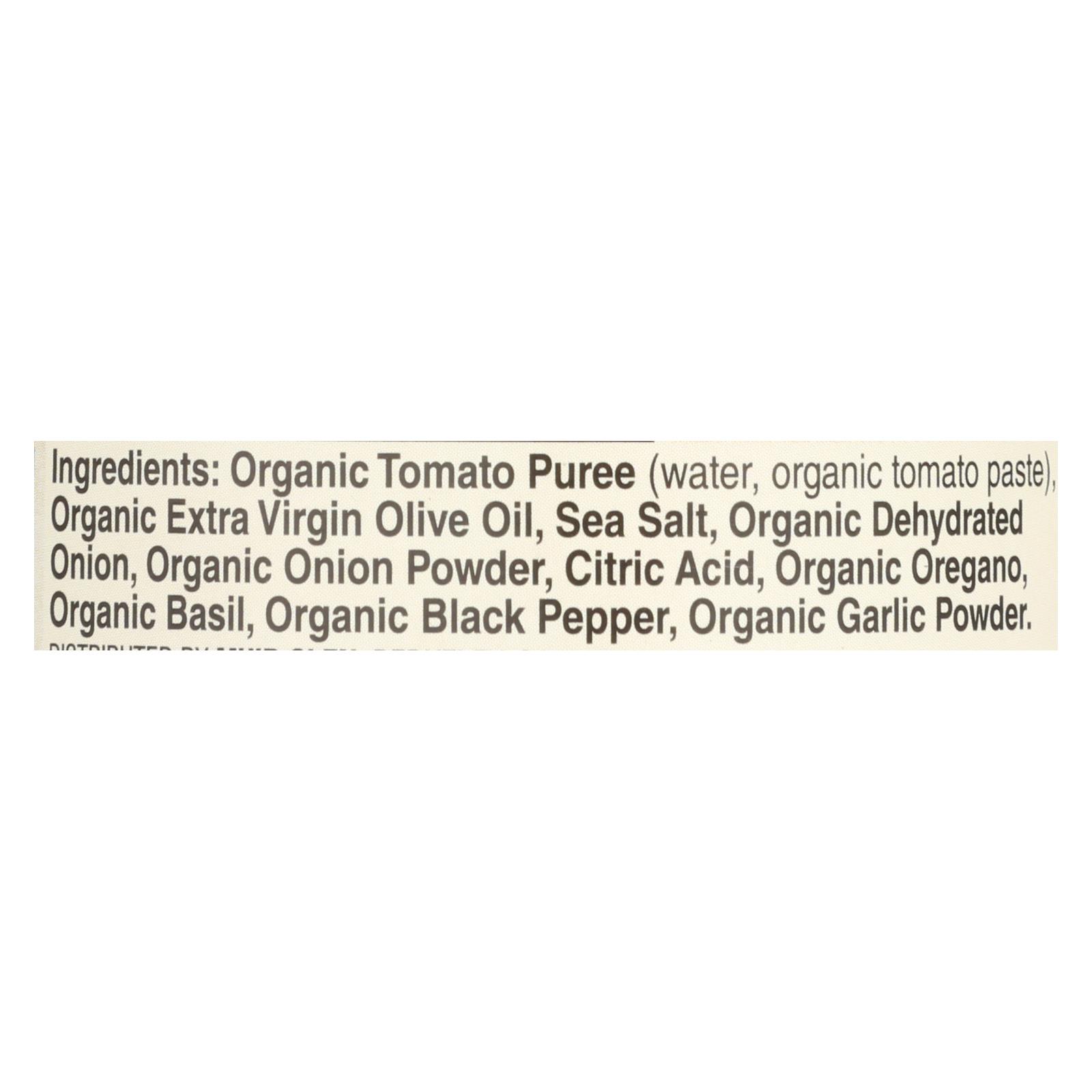 ingredients : organic tomato puree (water, organic tomato paste);organic extra virgin olive oil;sea salt;organic dehydrated onion;organic onion powder;citric acid;organic oregano;organic basil;organic black pepper;organic garlic powder