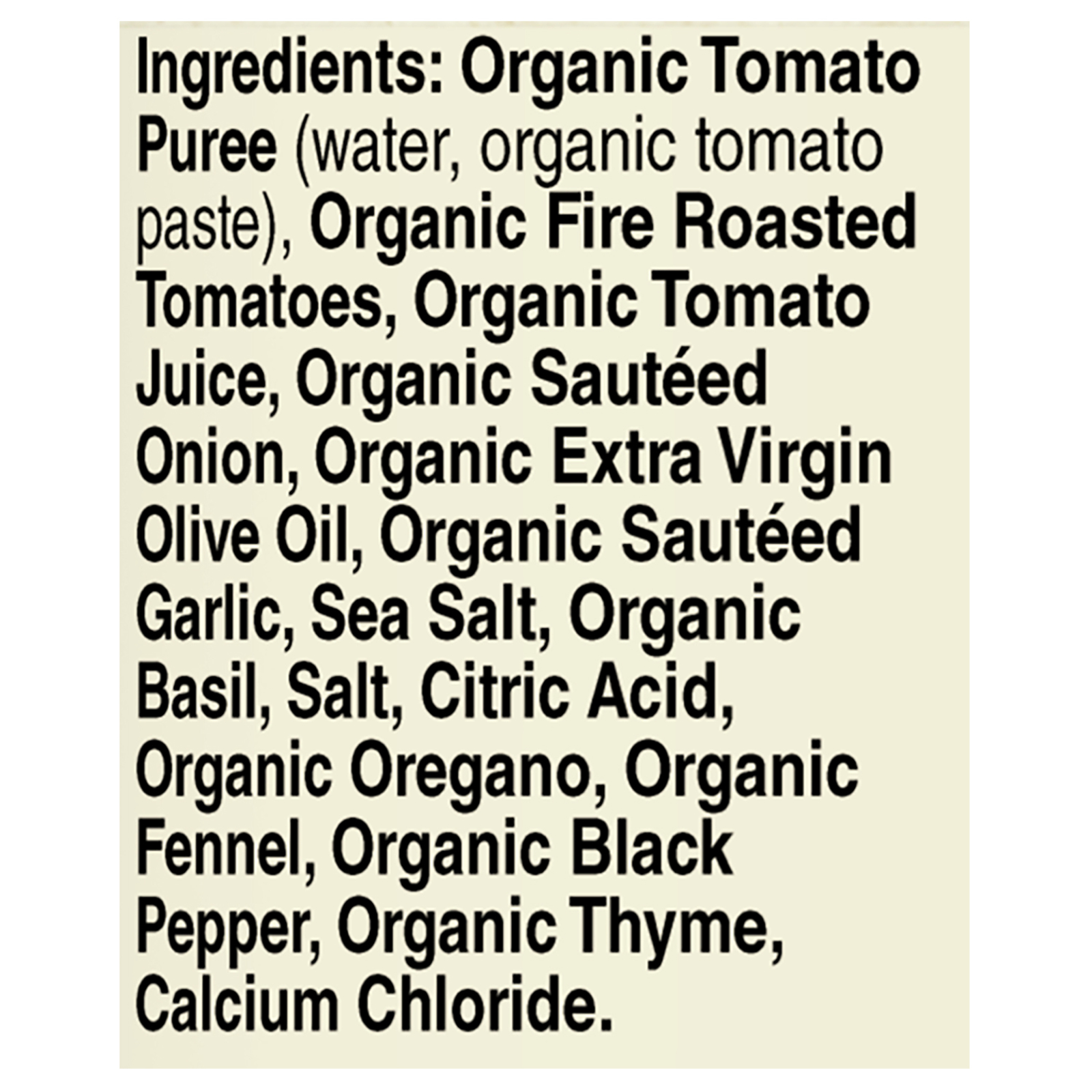 ingredients : organic tomato puree (water, organic tomato paste);organic fire roasted tomatoes;organic tomato juice;organic saut ed onion;organic extra virgin olive oil;organic saut ed garlic;sea salt;organic basil;salt;citric acid;organic oregano;organic fennel;organic black pepper;organic thyme;calcium chloride