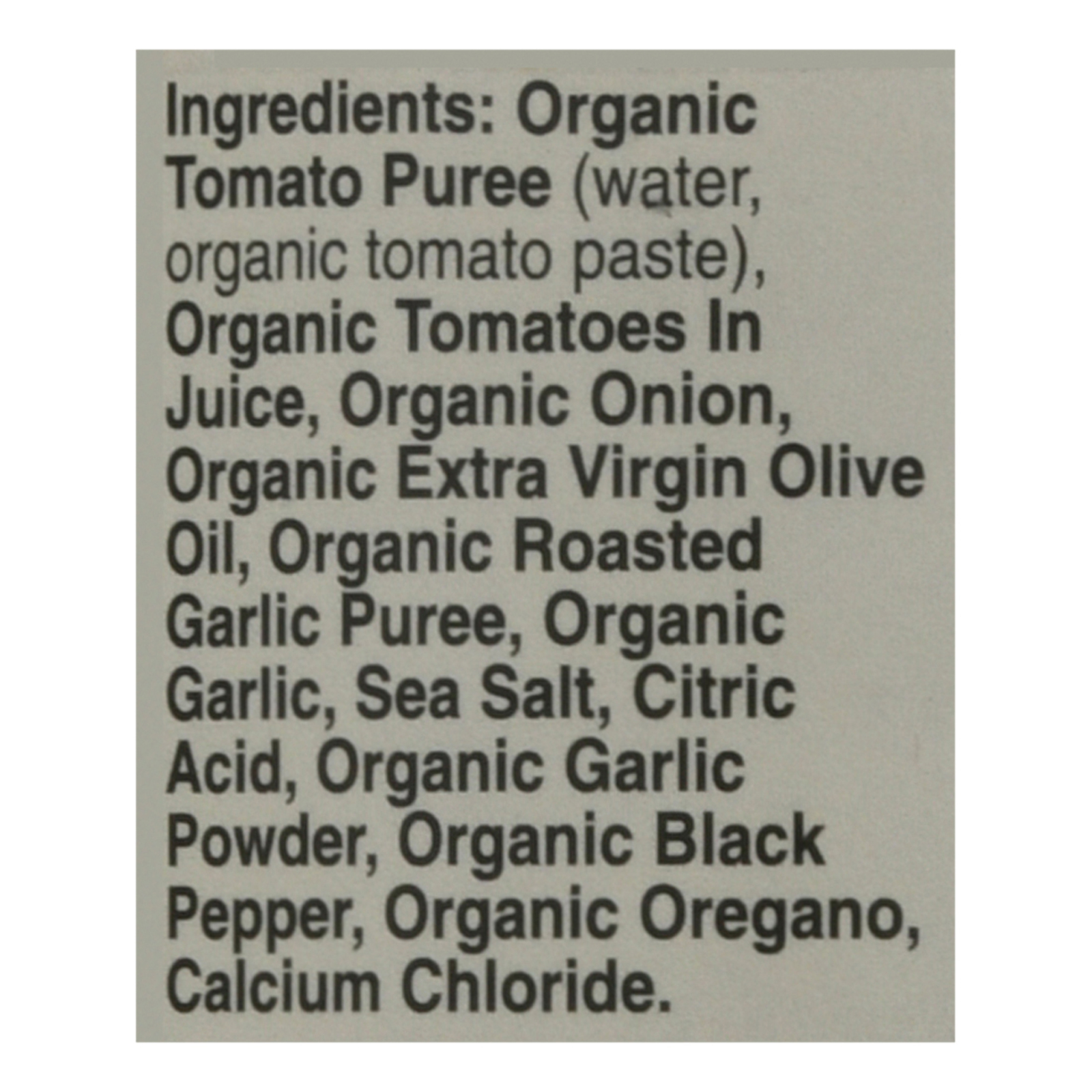 ingredients : organic tomato puree (water, organic tomato paste);organic tomatoes in juice;organic onion;organic extra virgin olive oil;organic roasted garlic puree;organic garlic;sea salt;citric acid;organic garlic powder;organic black pepper;organic oregano;calcium chloride