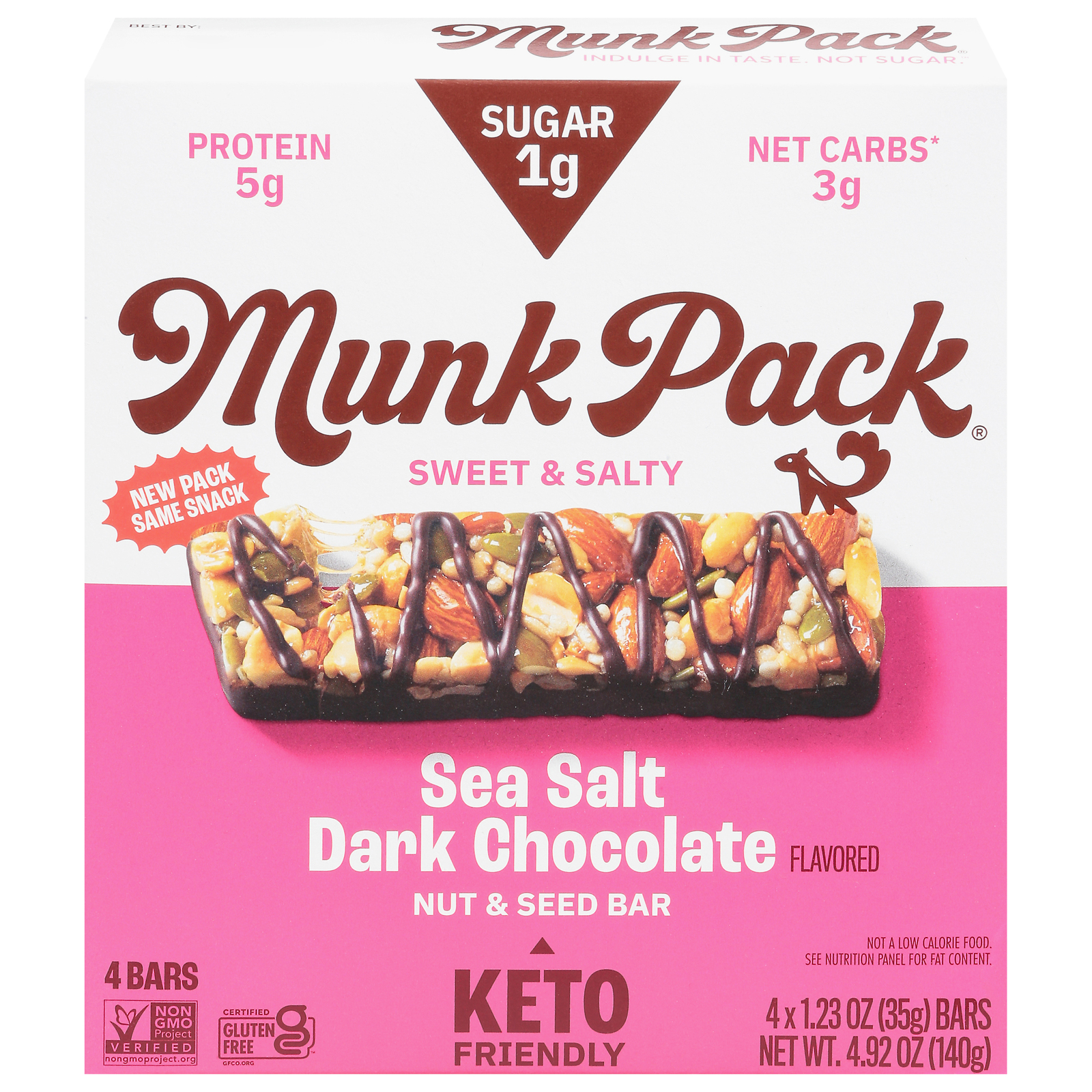 Sweet & salty! plant based. Our goal through munk pack is to empower you to lead an active, well-balanced lifestyle. We see a world where happiness is cultivated by connecting with nature and taking good care of your body. Enjoy! michelle & toby. Your world is what you make it. Choose your adventure. Take chances. Fuel your life. Sold by weight, not volume. Bite into our sea salt dark chocolate flavored keto nut & seed bar and enjoy the sweet and salty flavors you crave, but with only 3 g net carbs (net carb calculation: total carb. (14 g) – fiber (4 g) – allulose (7 g) = 3 g net carbs). With crunchy whole pieces of nuts and seeds covered in a delicious, dark chocolatey drizzle, this snack combines our favorite ingredients in a convenient, ready-to-eat bar. Please recycle this carton after use.