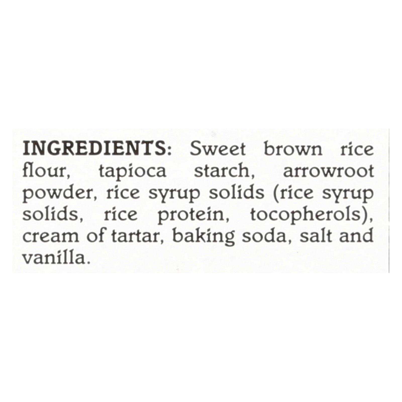 Sweet brown rice flour, tapioca starch, arrowroot powder, rice syrup solids, rice protein, tocopherols, cream of tartar, baking soda, salt, vanilla.