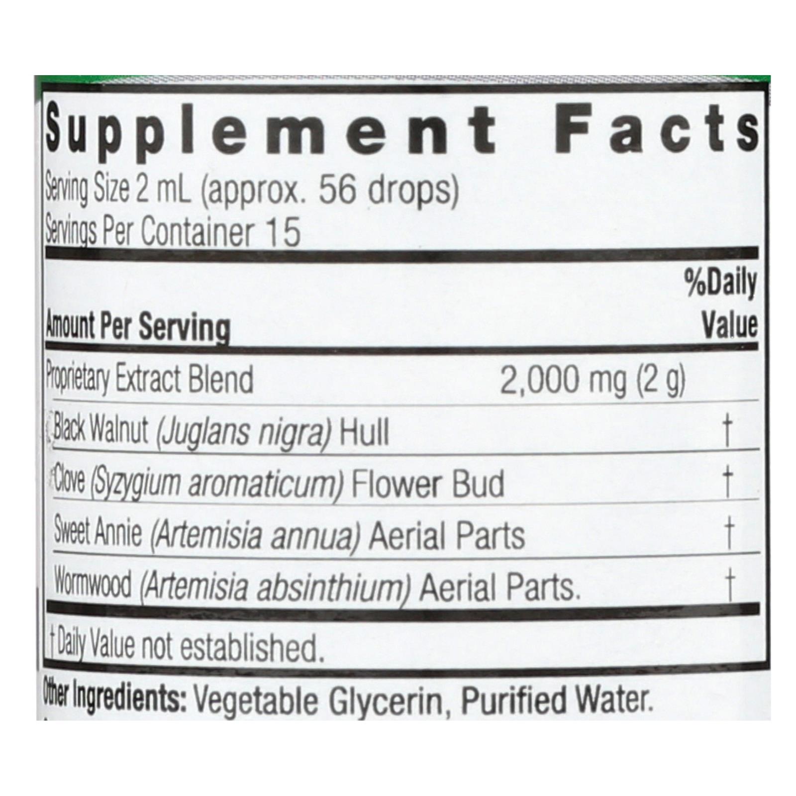 Black Walnut Extract, Wormwood Extract, Other all-natural ingredients.