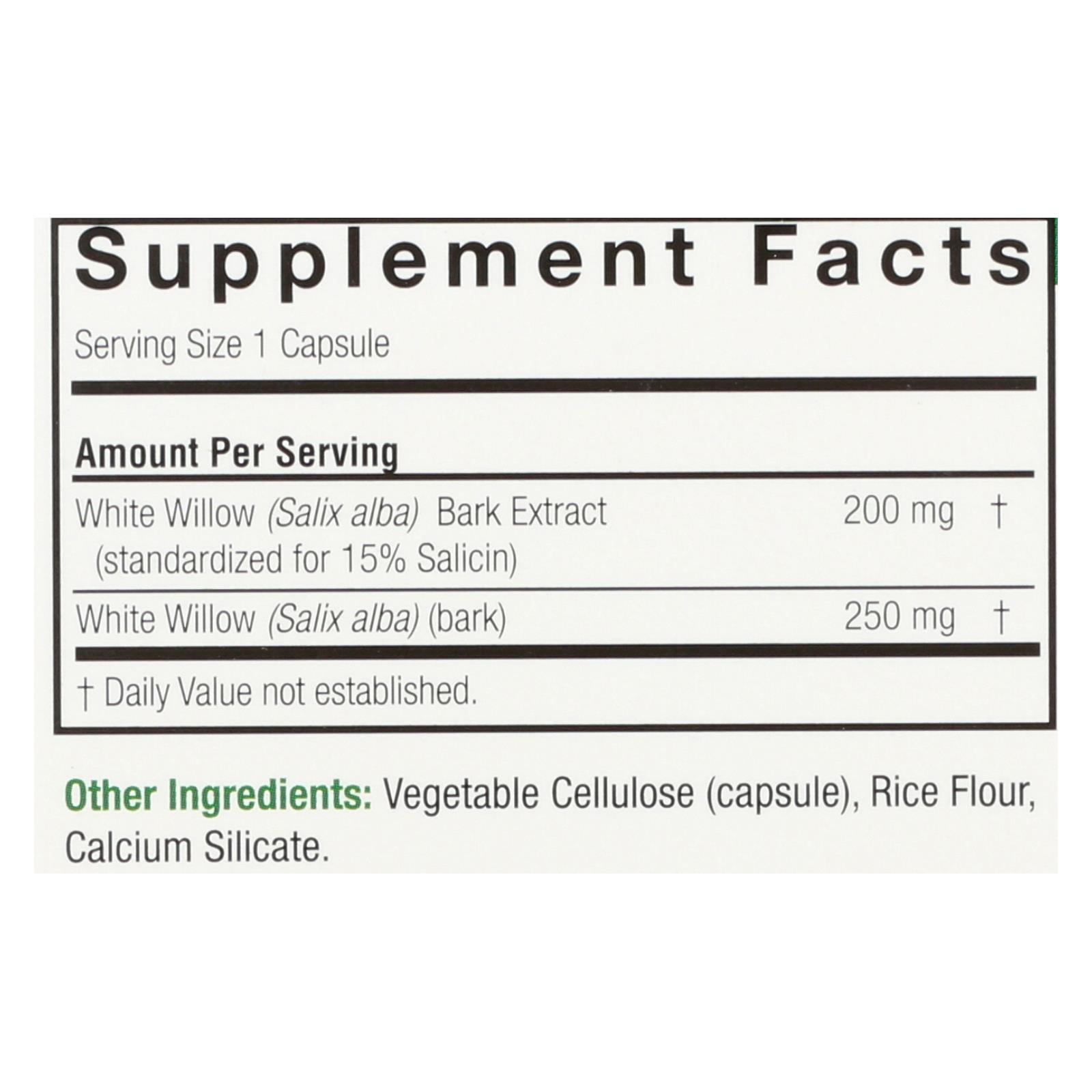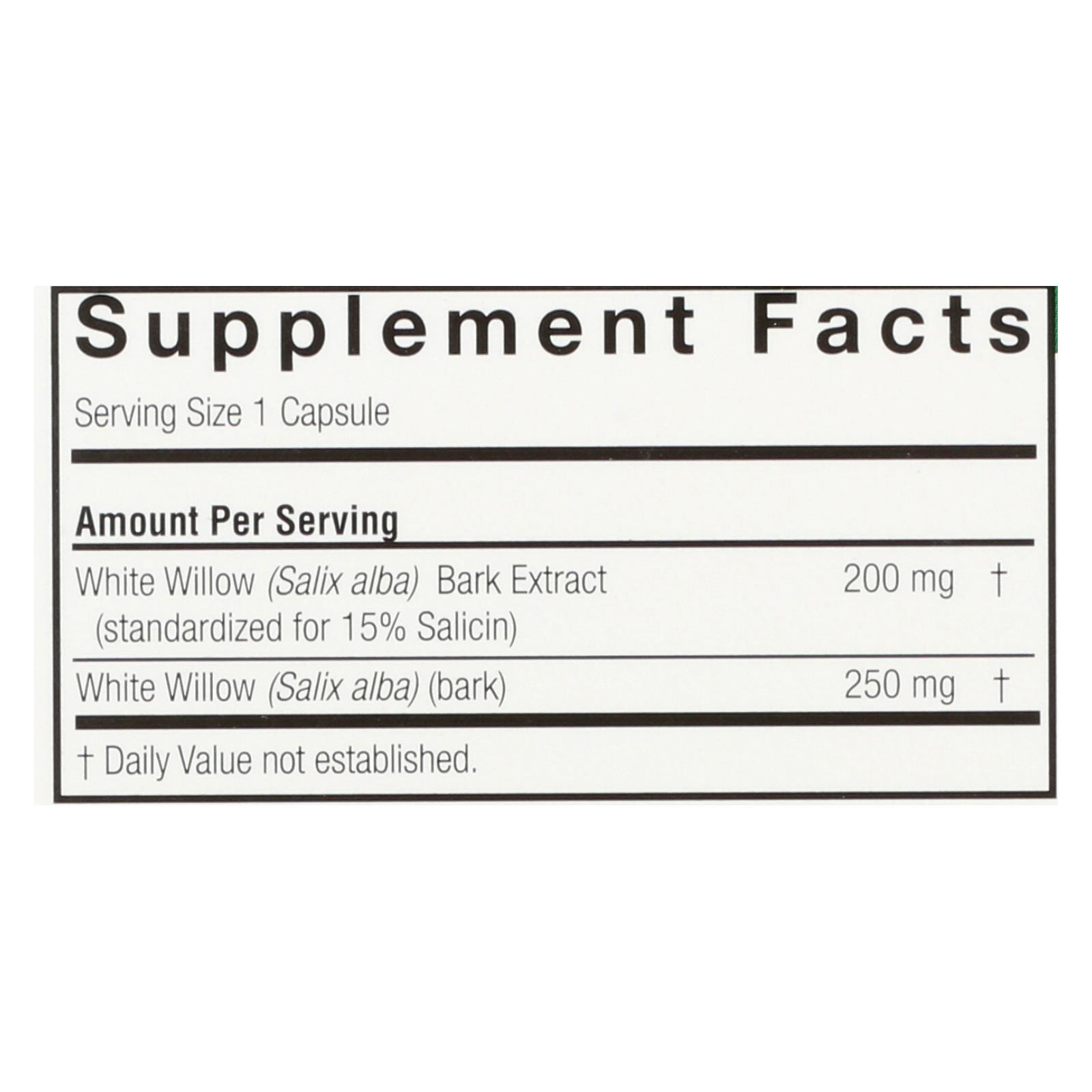 White willow bark standardized extract (full ingredient list not provided by manufacturer).