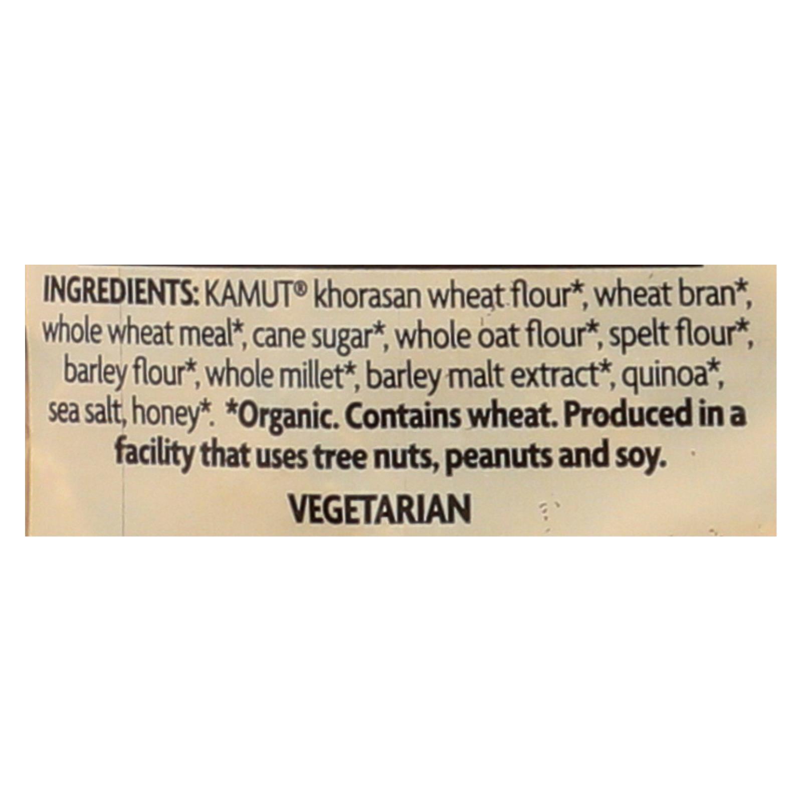 ingredients : kamut® khorasan wheat flour;wheat bran;whole wheat meal;cane sugar;whole oat flour;spelt flour;barley flour;whole millet;barley malt extract;quinoa;sea salt;honey