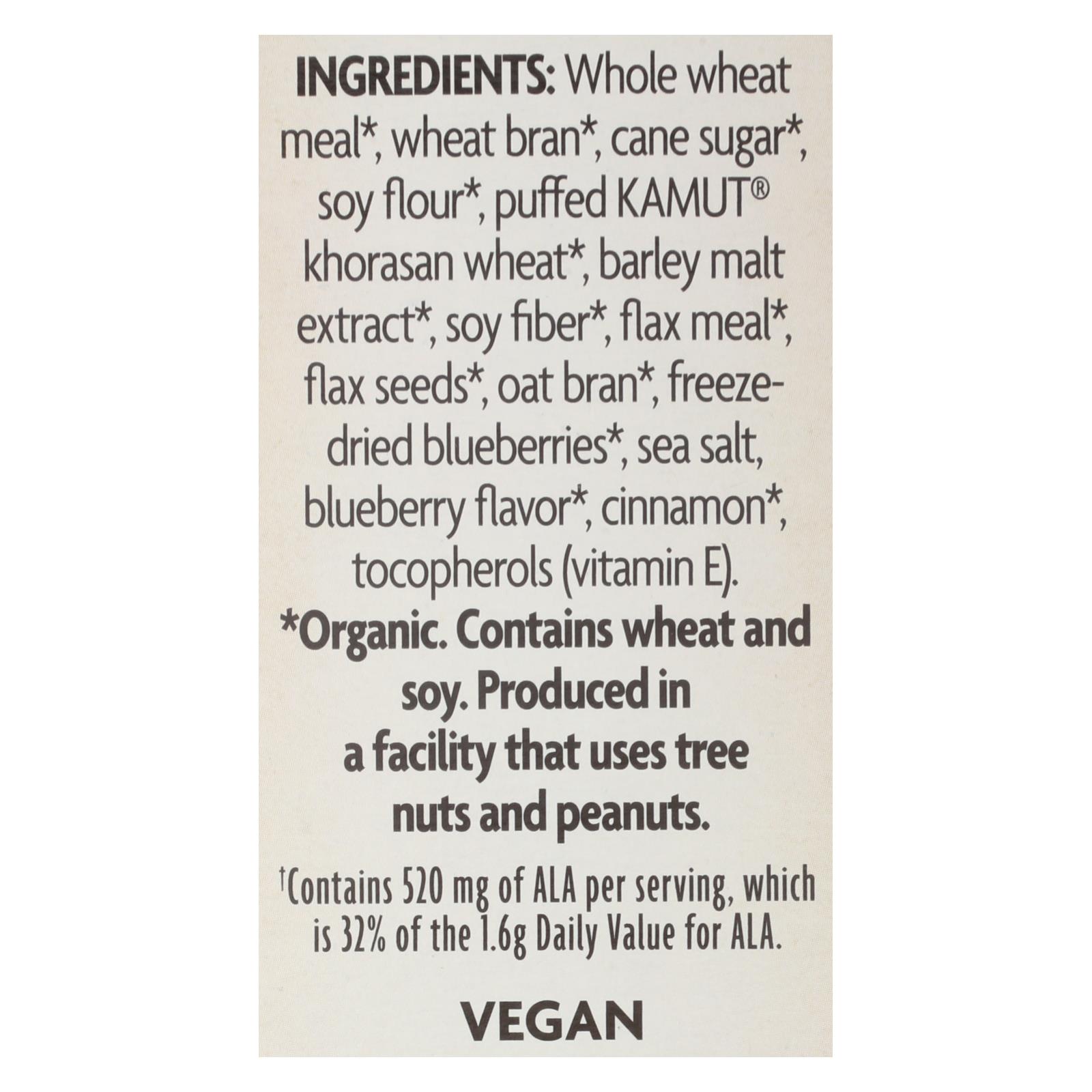 Whole wheat meal, wheat bran, cane sugar, soy flour, puffed Kamut® khorasan wheat, barley malt extract, soy fiber, flax meal, flax seeds, oat bran, freeze-dried blueberries, sea salt, blueberry flavor, cinnamon, tocopherols (vitamin E).