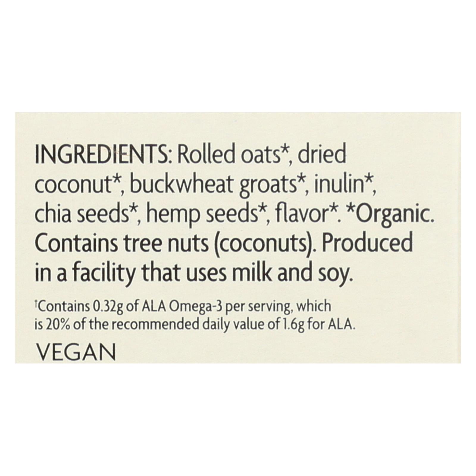 This oatmeal features a thoughtful mix of rolled oats, buckwheat groats, chia seeds, and dried coconut. Rolled oats and buckwheat are excellent sources of whole grains, while chia and hemp seeds are commonly used in wellness traditions for their omega-3 fatty acids and plant-based protein. The addition of inulin, a natural fiber, supports a balanced start to your morning.