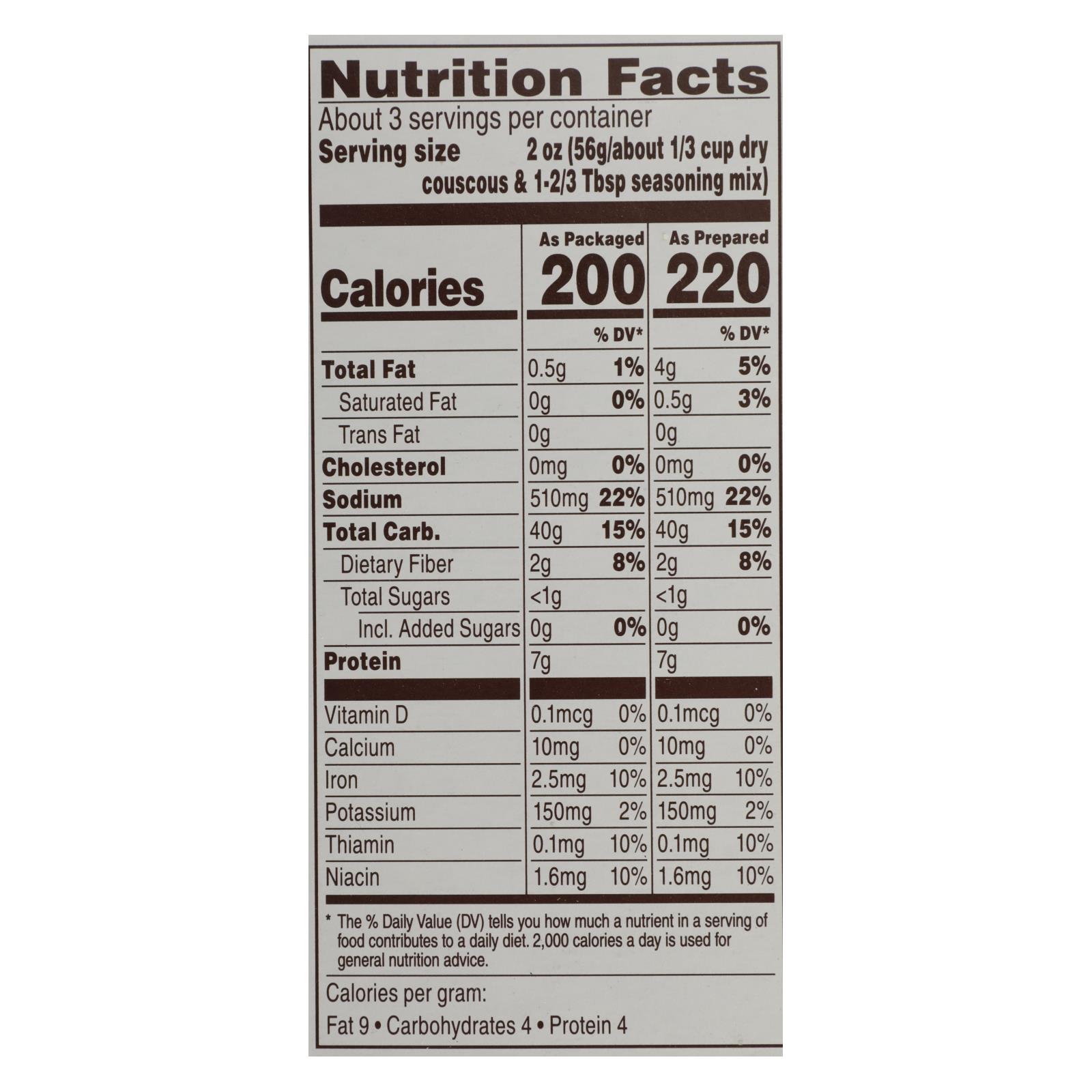 Per serving: 200 calories; 0 g sat fat (0% dv); 510 mg sodium (22% dv); less than 1 g total sugars. Cooks in 5 minutes. At near east, we’re inspired by how well the world eats. Our journey began 50 years ago with a single, homemade armenian rice pilaf recipe. Today, the brand has expanded to a family of hearty grains, blended with vibrant spices and herbs from across the globe. Our simple yet flavorful dishes provide creative inspiration for any meal. This package is sold by weight, not by volume. Contents settle during shipping and handling. Neareast.com. We’re here to help. Neareast.com or 800.222.7423. Please have package available when calling.