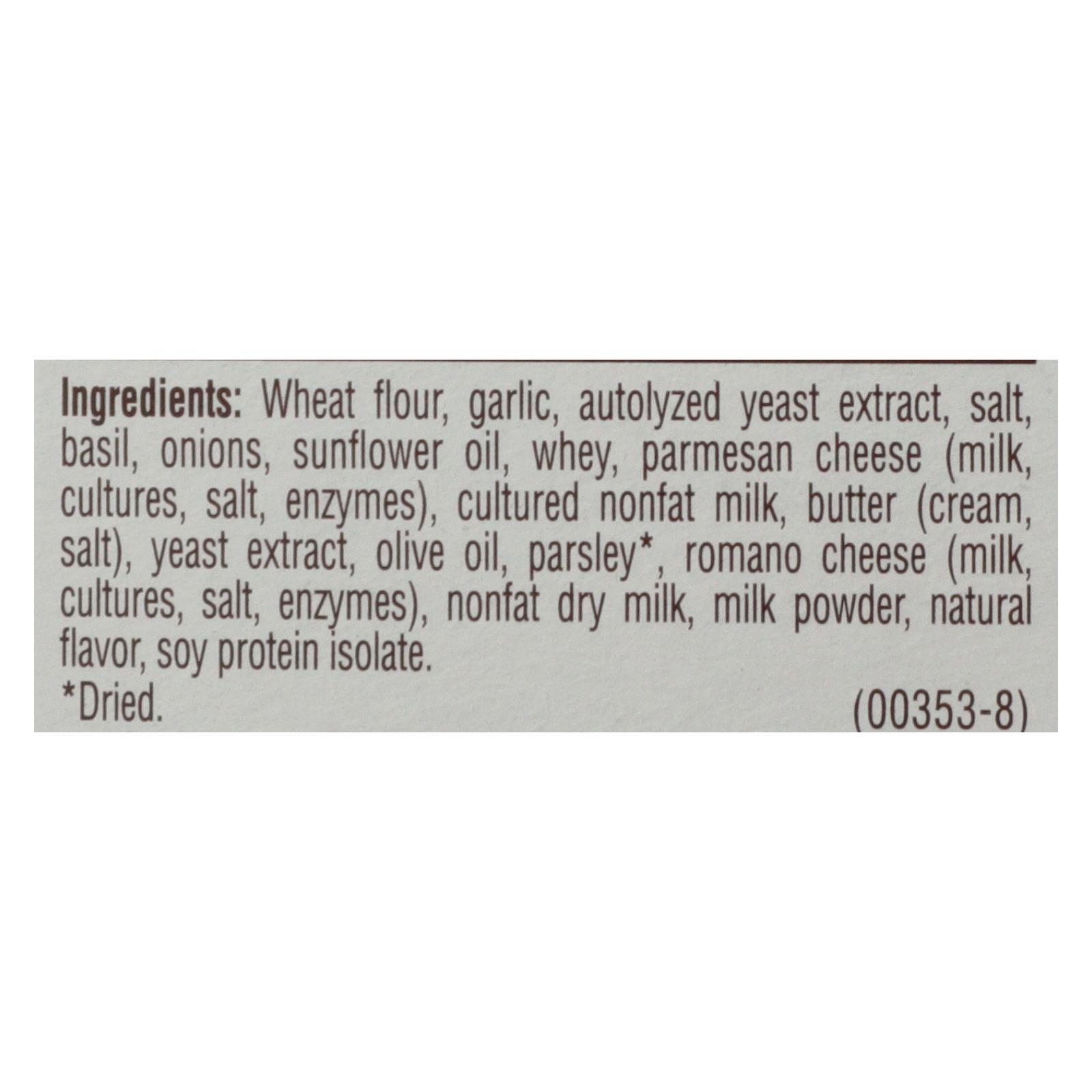 wheat flour, garlic, autolyzed yeast extract, salt, basil, onions, sunflower oil, whey, parmesan cheese, milk, cultures, enzymes, cultured nonfat milk, butter, cream, yeast extract, olive oil, parsley, romano cheese, nonfat dry milk, milk powder, natural flavor, soy protein isolate