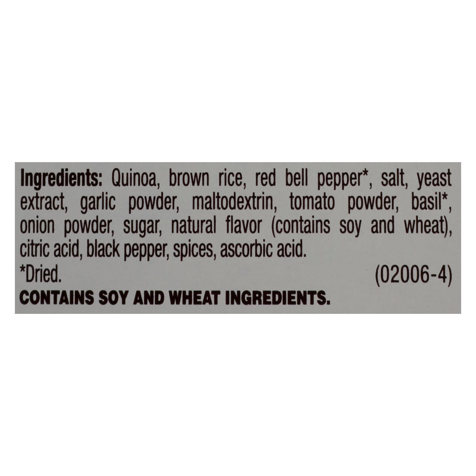 ingredients : quinoa;brown rice;red bell pepper;salt;yeast extract;garlic powder;maltodextrin;tomato powder;basil;onion powder;sugar;natural flavor;contains soy and wheat;citric acid;black pepper;spices;ascorbic acid