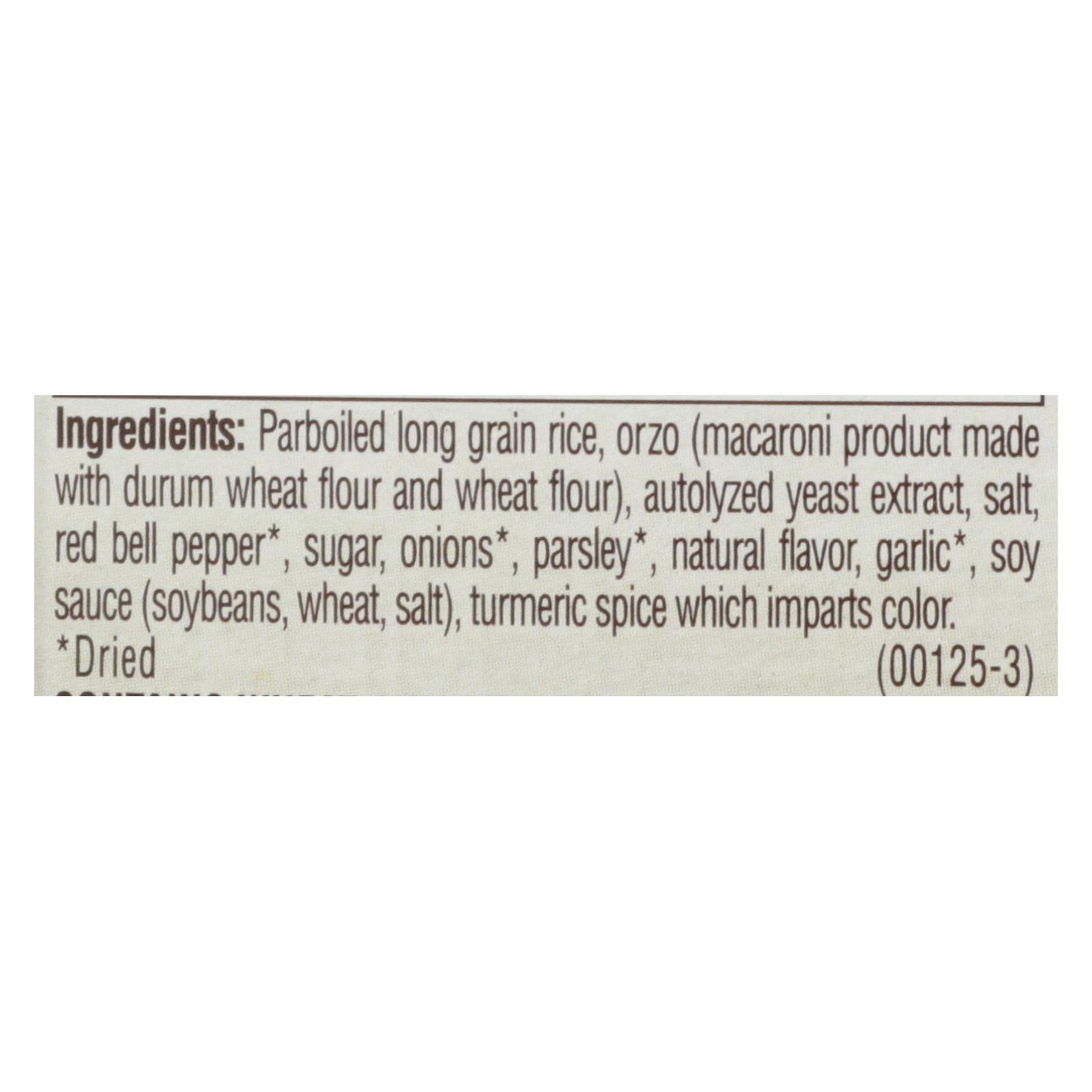 Rice, wheat flour, durum wheat flour, autolyzed yeast extract, salt, red bell pepper, sugar, onions, parsley, natural flavor, garlic, soy sauce (soybeans, wheat), turmeric, color.