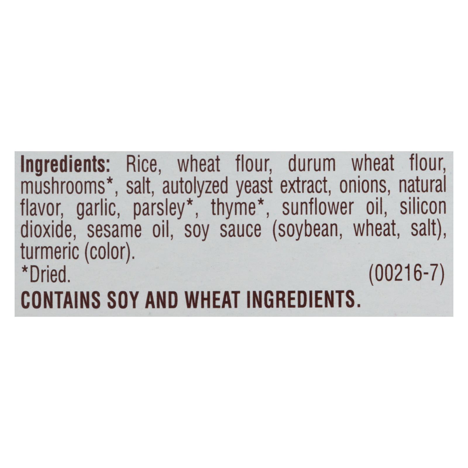 Rice, wheat flour, durum wheat flour, mushrooms, salt, autolyzed yeast extract, onions, natural flavor, garlic, parsley, thyme, sunflower oil, silicon dioxide, sesame oil, soy sauce (soybean, wheat), turmeric, color.
