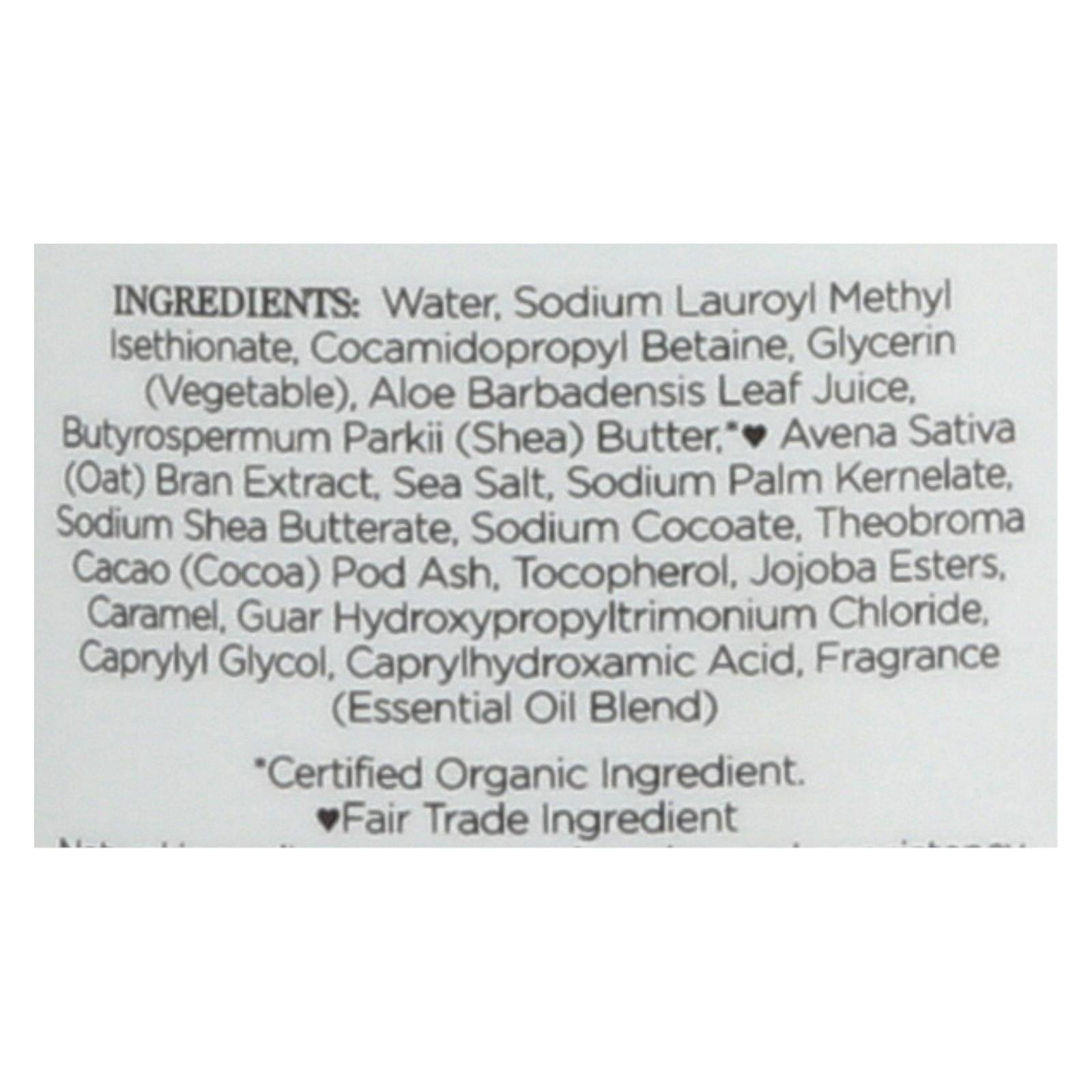 ingredients : water;sodium lauroyl methyl isethionate;cocamidopropyl betaine;glycerin;vegetable;aloe barbadensis leaf juice;butyrospermum parkii;shea;butter;♥ avena sativa;oat;bran extract;sea salt;sodium palm kernelate;sodium shea butterate;sodium cocoate;theobroma cacao;cocoa;pod ash;tocopherol;jojoba esters;caramel;guar hydroxypropyltrimonium chloride;caprylyl glycol;caprylhydroxamic acid;fragrance;essential oil blend