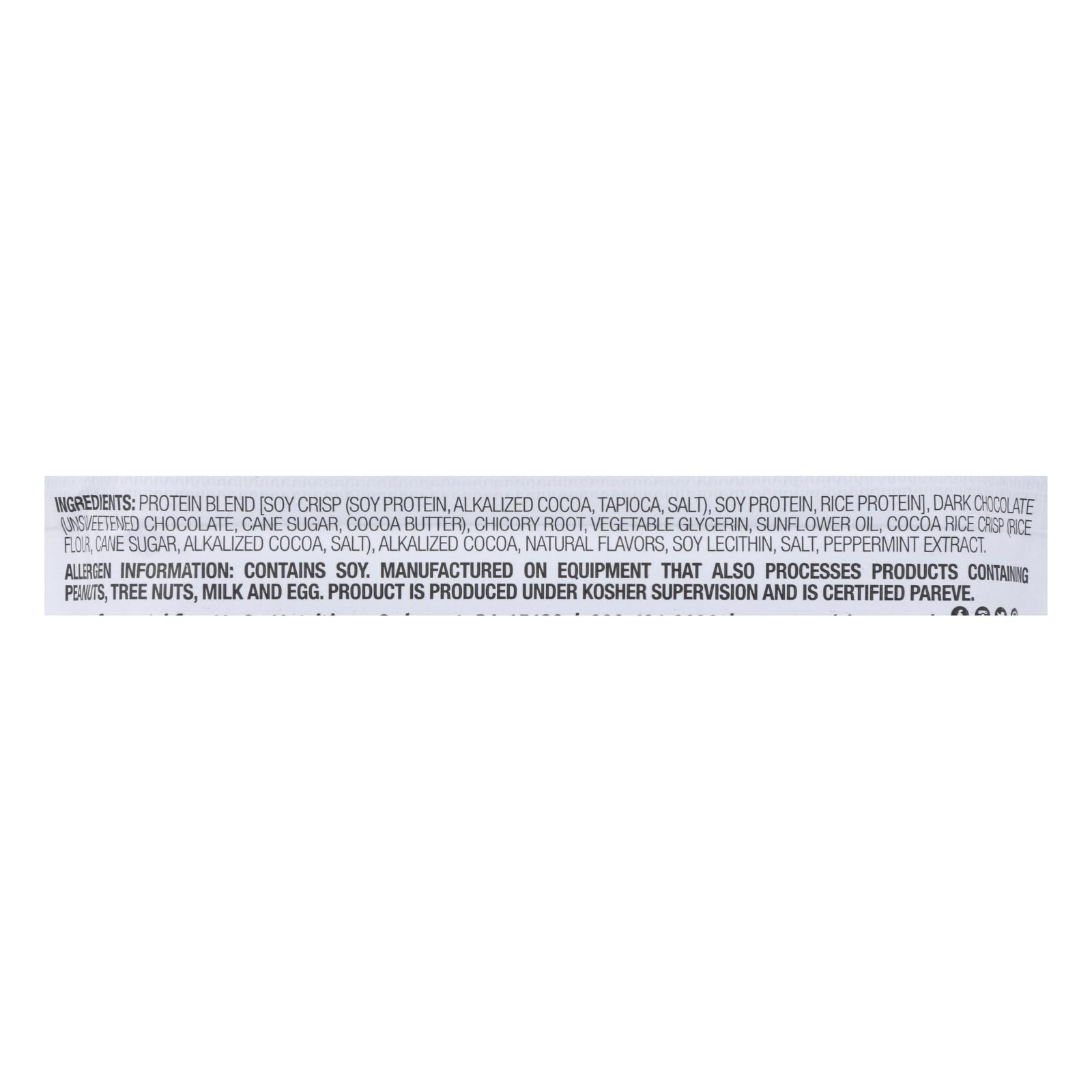 ingredients : protein blend [soy crisp (soy protein, alkalized cocoa, tapioca, salt), soy protein, rice protein];dark chocolate (unsweetened chocolate, cane sugar, cocoa butter);vegetable fiber (inulin);vegetable glycerin;sunflower oil;cocoa rice crisp (rice flour, cane sugar, alkalized cocoa, salt);alkalized cocoa;natural flavors;soy lecithin;salt;peppermint extract