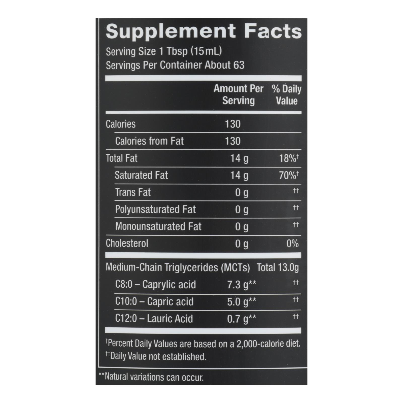 This oil is concentrated with medium-chain triglycerides (MCTs), specifically capric acid and caprylic acid, which are types of saturated fatty acids commonly found in coconuts. MCTs are valued in natural wellness for their ability to support healthy energy levels and are a popular choice among those following vegan, paleo, or plant-based diets. The oil is made using a USDA certified organic process, ensuring purity and quality.