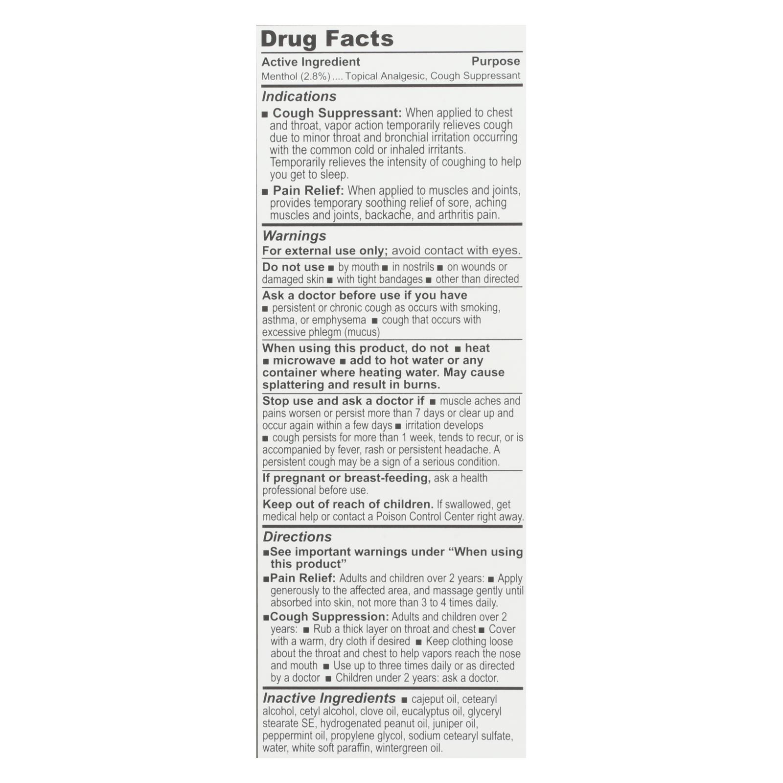 ingredients : ■ cajeput oil;cetearyl alcohol;cetyl alcohol;clove oil;eucalyptus oil;glyceryl stearate se;hydrogenated peanut oil;juniper oil;peppermint oil;propylene glycol;sodium cetearyl sulfate;water;white soft paraffin;wintergreen oil;menthol;2.8%;purpose topical analgesic;cough suppressant