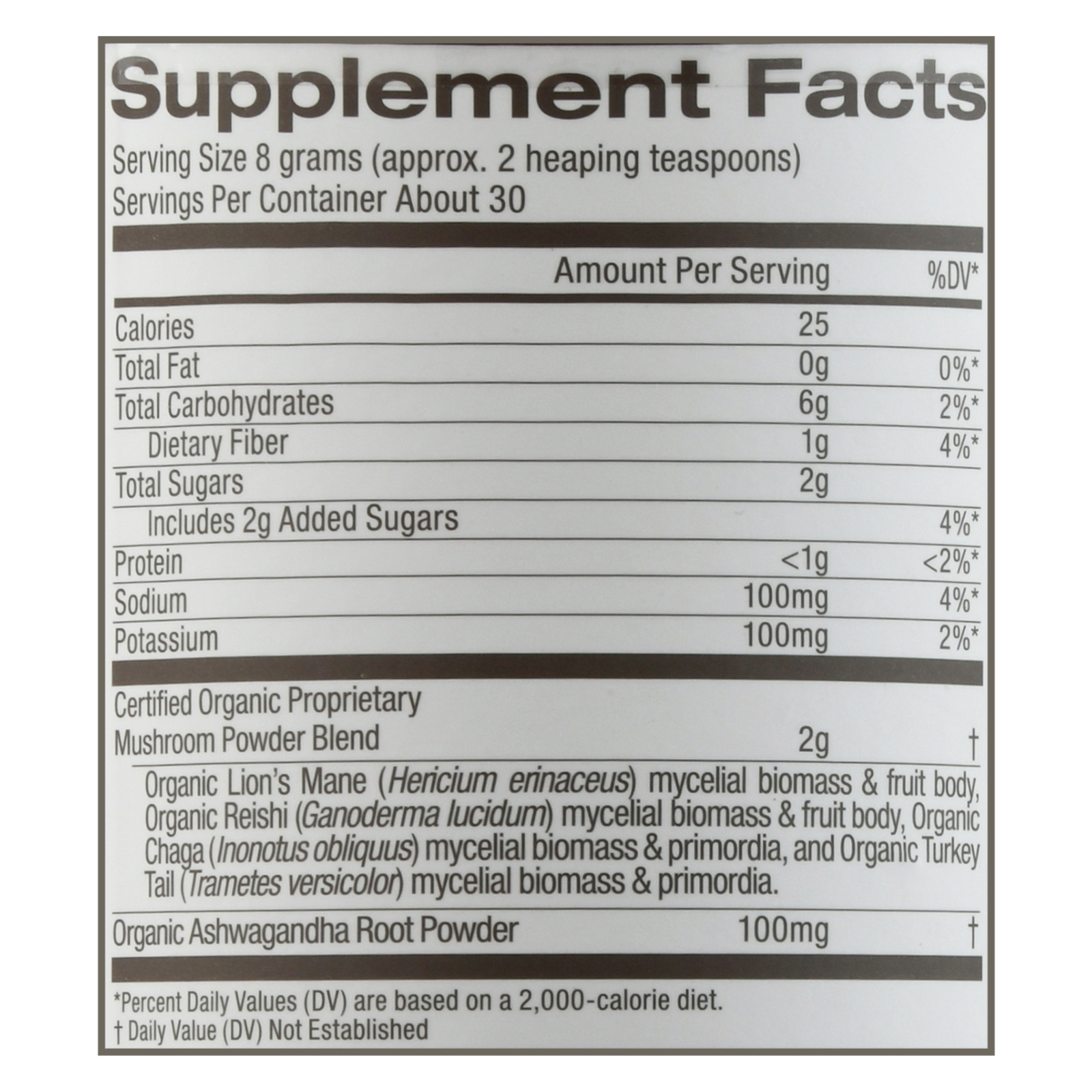 30 servings. Focus. Immunity. De-stress. Indulgent hot chocolate blend with lion’s mane, reishi, chaga, turkey tail & ashwagandha. Immune support. Lion’s mane, reishi, chaga, turkey tail & ashwagandha. Powerful superfoods. Premium, dutch cocoa known for its distinctive soft, creamy taste and packed with flavonoids, naturally-occurring antioxidants to help fight against free radicals. Combined with organic lion’s mane, reishi, chaga and turkey tail superfood mushrooms, plus ashwagandha for centering and vibrant health. Lion’s name – the smart mushroom. Helps support memory, focus, nerve health, creativity and mood. Reishi – shroom away stress. An adaptogen revered by traditional herbalists for its ability to help the body cope with everyday physical and mental stress by restoring balance and immune health. Chaga – the mushroom of youth. A polyphenol powerhouse that helps outsmart free radicals to support immunity and promote healthy aging at any age. Turkey tail – your immune defense. A vegan mushroom with immune supporting benefits. One of the most researched functional mushrooms for its powerful polyaccharides. Ashwagandha – traditional tonic. The berry and root of the ashwagandha plant have been used as a traditional ayurvedic tonic in india for many years and are commonly used today for their benefits in managing occasional stress and anxiousness.