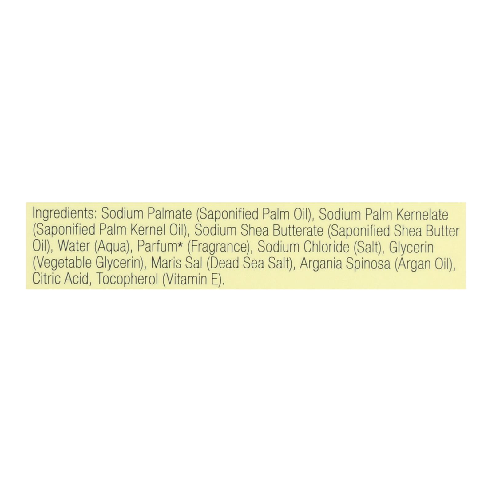 ingredients : sodium palmate;saponified palm oil;sodium palm kernelate;saponified palm kernel oil;sodium shea butterate;saponified shea butter oil;water;aqua;parfum;fragrance;sodium chloride;salt;glycerin;vegetable glycerin;maris sal;dead sea salt;argania spinosa;argan oil;citric acid;tocopherol;vitamine