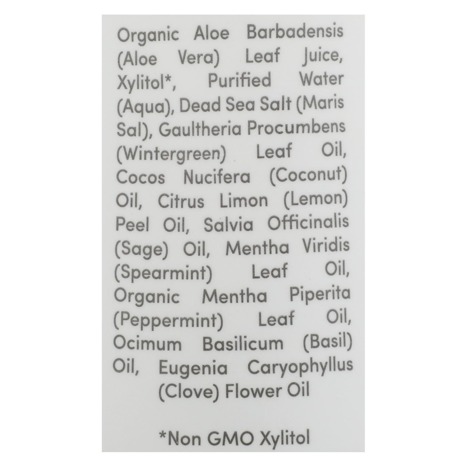 ingredients : organic aloe barbadensis;aloe vera;leaf juice;xylitol;purified water;aqua;dead sea salt;maris sal;gaultheria procumbens;wintergreen;leaf oil;cocos nucifera;coconut;oil;citrus limon;lemon;peel oil;salvia officinalis;sage;mentha viridis;spearmint;organic mentha piperita;peppermint;ocimum basilicum;basil;eugenia caryophyllus;clove;flower oil
