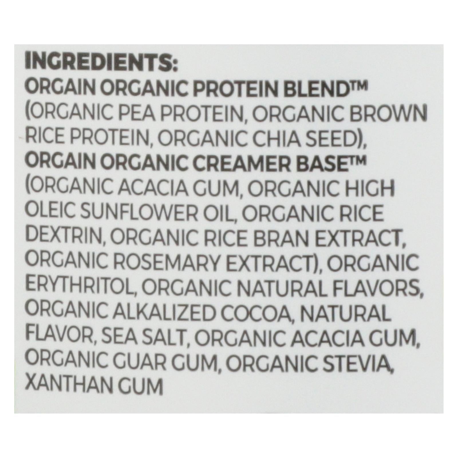 ingredients : orgain organic protein blend™;organic pea protein;organic brown rice protein;organic chia seed;orgain organic creamer base™;organic acacia;organic high oleic sunflower oil organic rice dextrin;organic rice bran extract;organic rosemary extract;organic erythritol;organic alkalized cocoa;organic natural flavors;sea salt;organic stevia organic guar gum;natural flavor;xanthan gum