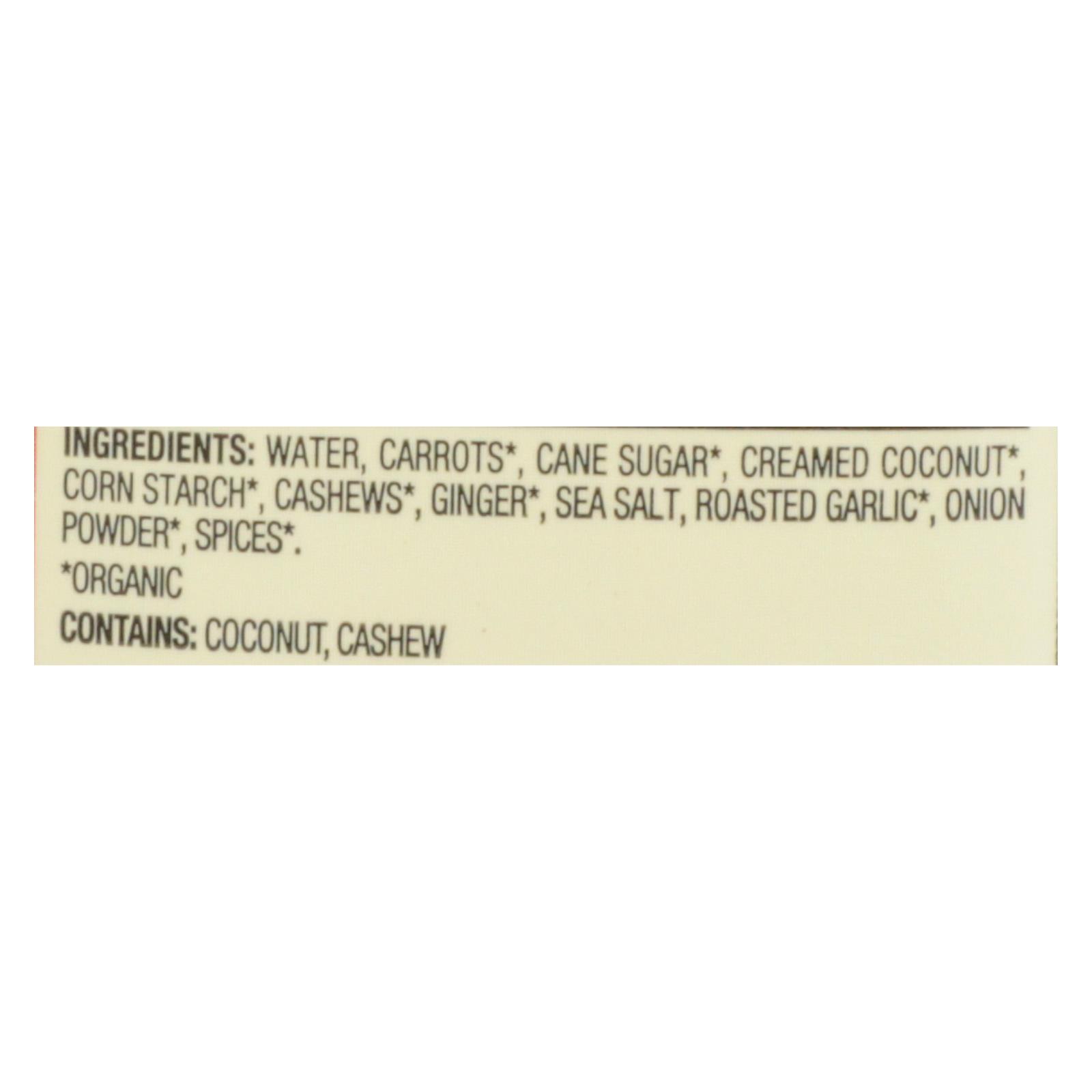 Water, carrots, cane sugar, creamed coconut, corn starch, cashews, ginger, sea salt, roasted garlic, onion powder, spices.