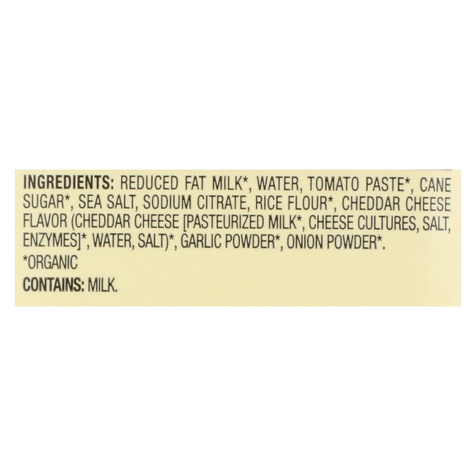Reduced fat milk, water, tomato paste, cane sugar, sea salt, sodium citrate, rice flour, cheddar cheese flavor, cheddar cheese (pasteurized milk, cheese cultures, salt, enzymes), garlic powder, onion powder.