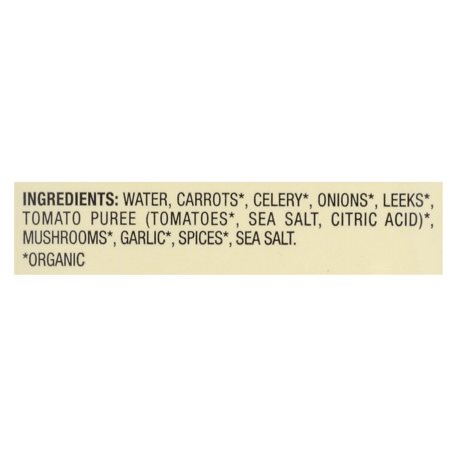 ingredients : water;carrots;celery;onions;leeks;tomato puree;tomatoes;sea salt;citric acid;mushrooms;garlic;spices