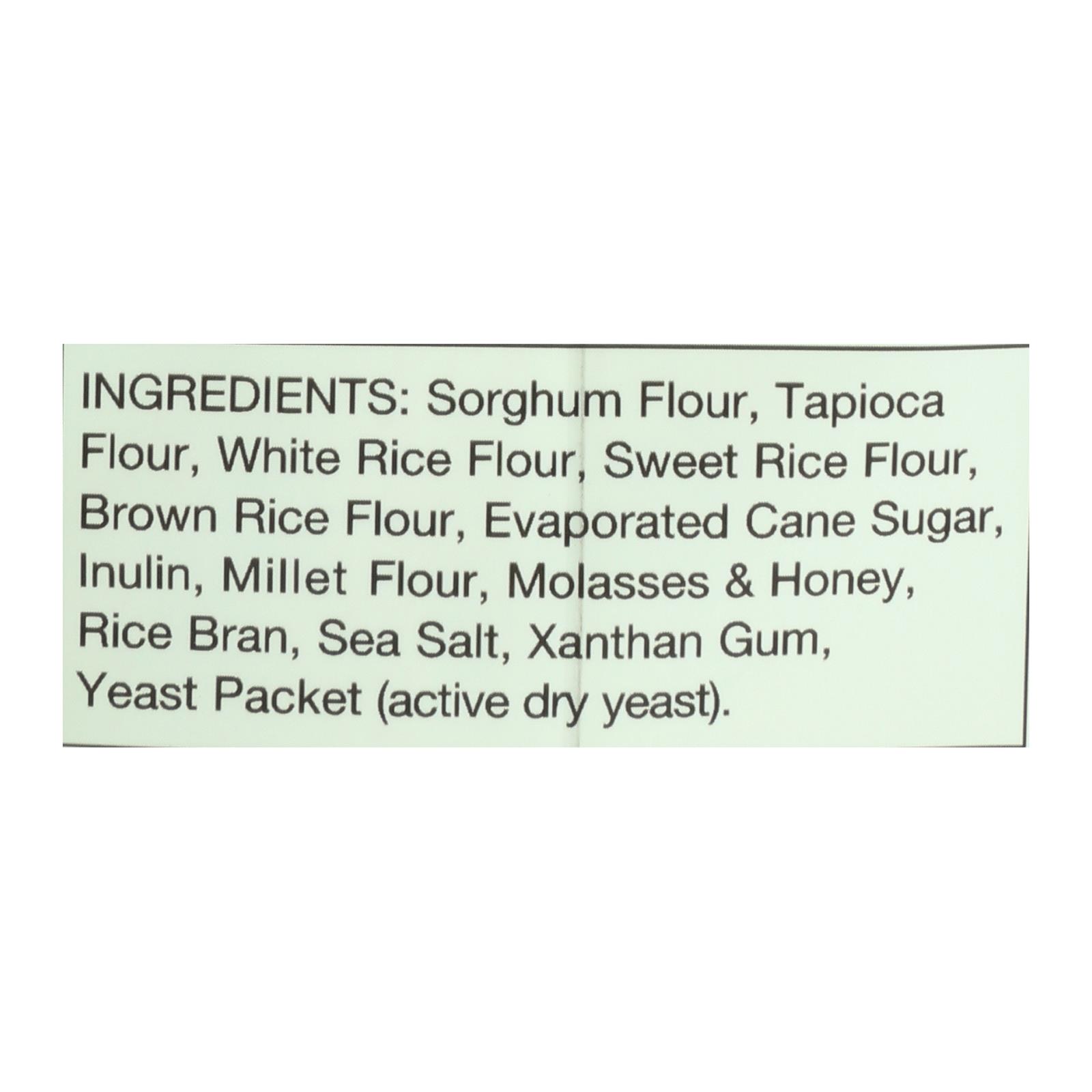 Sorghum flour, tapioca flour, white rice flour, sweet rice flour, brown rice flour, evaporated cane sugar, inulin, millet flour, honey, rice bran, sea salt, xanthan gum, yeast packet (active dry yeast)