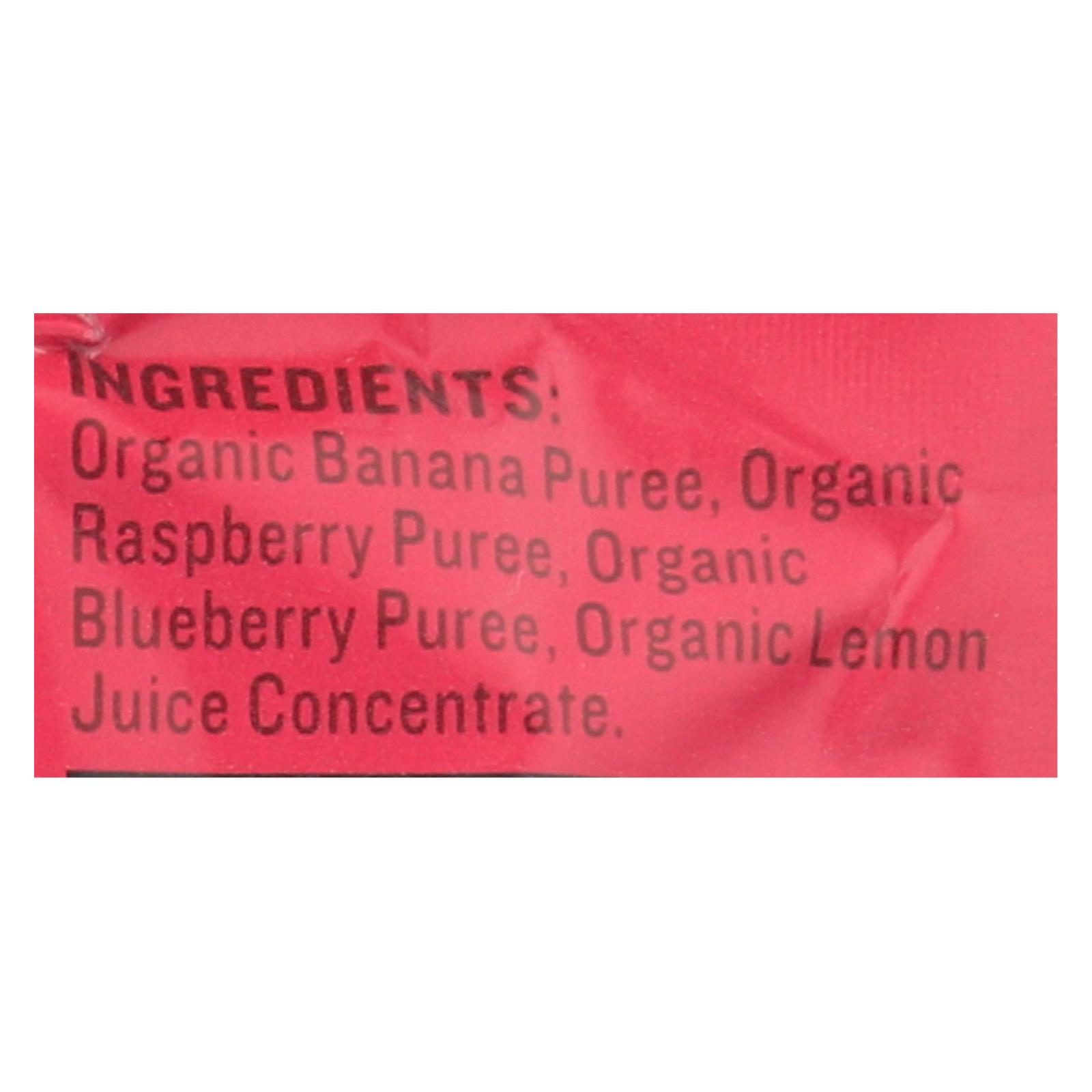 Organic banana puree, organic raspberry puree, organic blueberry puree, organic lemon juice concentrate.