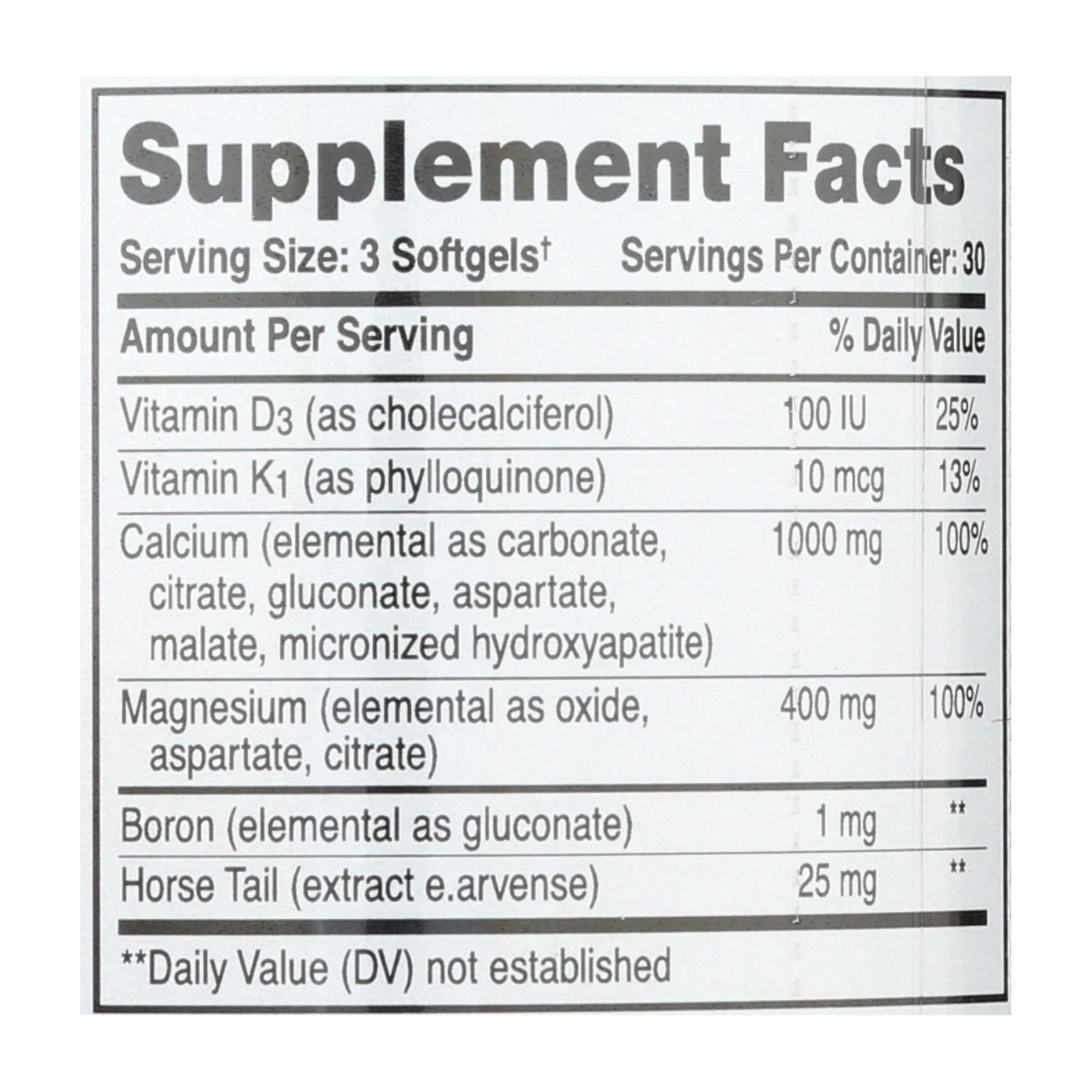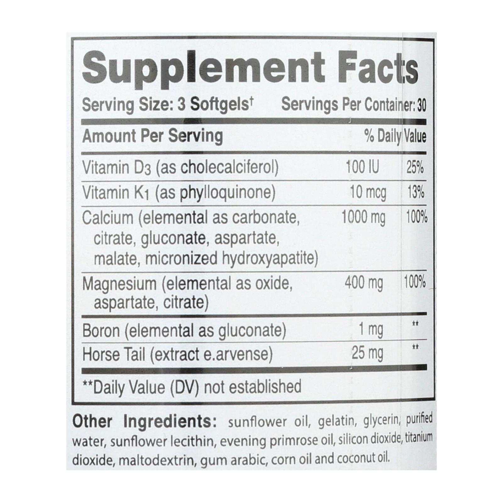 Six forms of calcium, three forms of magnesium, vitamin D3, vitamin K1. Non-GMO, gluten-free, and free from preservatives.