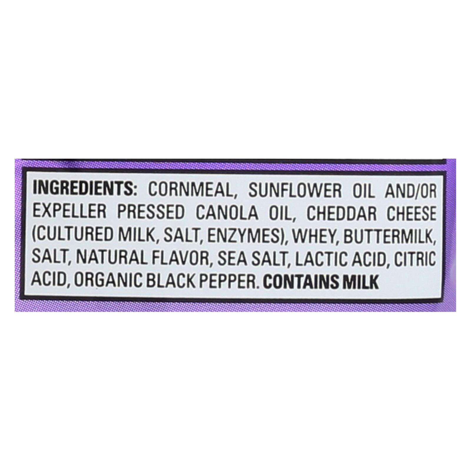 Cornmeal, sunflower oil and/or expeller pressed canola oil, cheddar cheese (cultured milk, salt, enzymes), whey, buttermilk, natural flavor, sea salt, lactic acid, citric acid, organic black pepper.