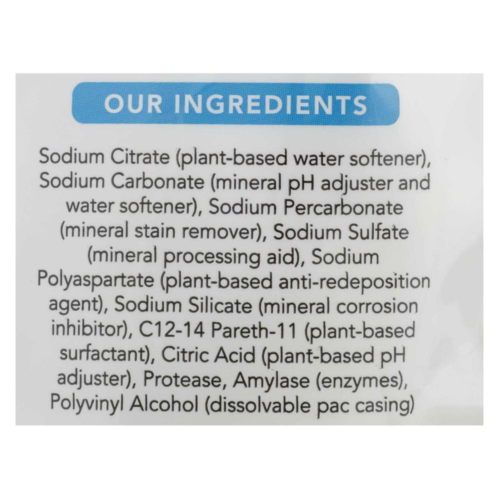 ingredients : sodium citrate (plant-based water softener);sodium carbonate (mineral ph adjuster and water softener);sodium percarbonate (mineral stain remover);sodium sulfate (mineral processing aid);sodium polyaspartate (plant-based anti-redeposition agent);sodium silicate (mineral corrosion inhibitor);c12-14 pareth-11 (plant-based surfactant);citric acid (plant-based ph adjuster);protease;amylase (enzymes);polyvinyl alcohol (dissolvable pac casing)