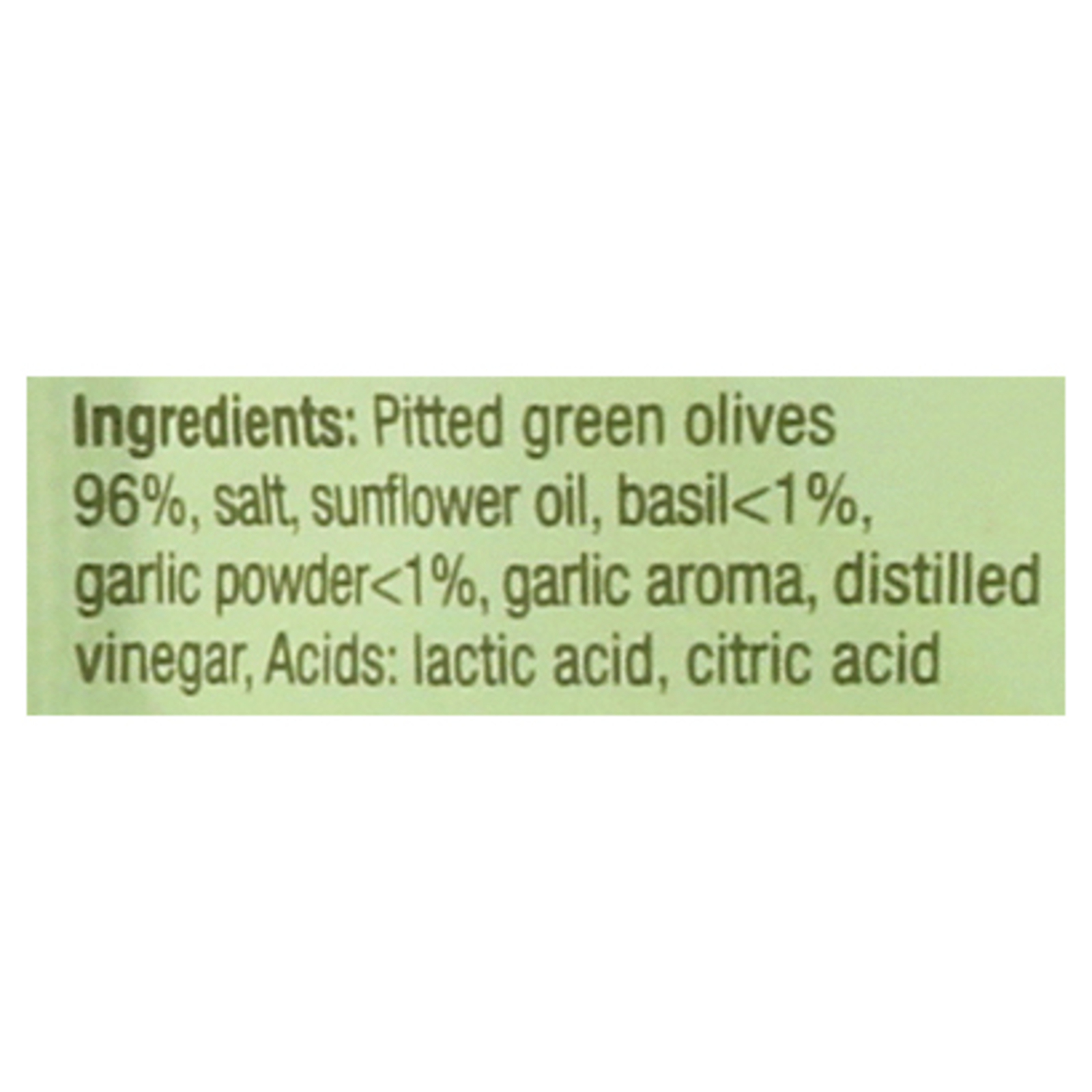 ingredients : pitted green olives 96%;salt;sunflower oil;basil <1%;garlic powder<1%;garlic aroma;distilled vinegar;acids: lactic acid, citric acid