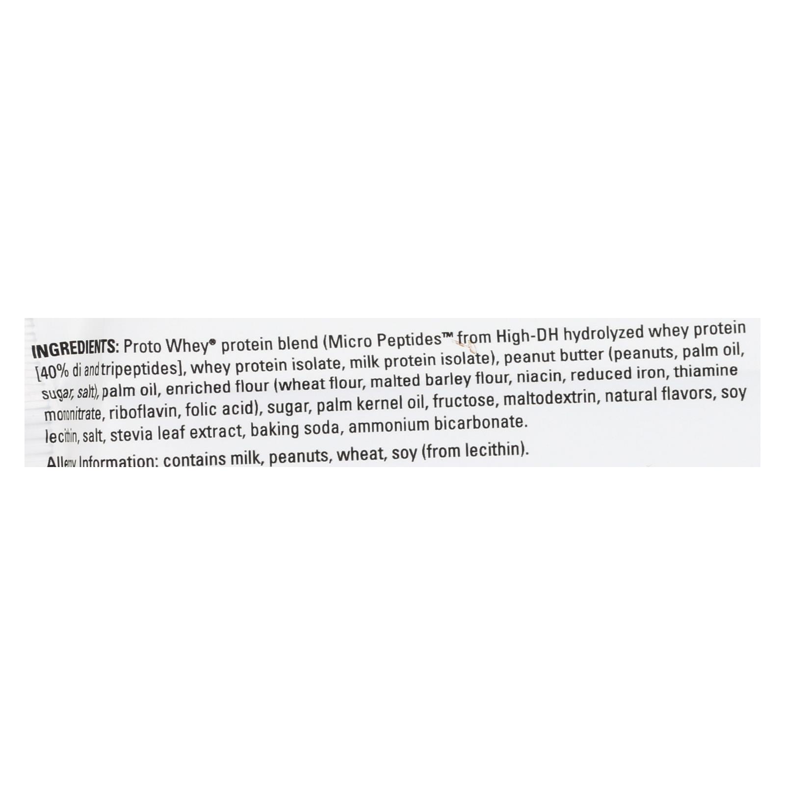ingredients : proto whey® protein blend;micro peptides™ from high-dh hydrolyzed whey protein [40% di and tripeptides];whey protein isolate;milk protein isolate;peanut butter;peanuts;palm oil;sugar;salt;enriched flour;wheat flour;malted barley flour;niacin;reduced iron;thiamine mononitrate;riboflavin;folic acid;palm kernel oil;fructose;maltodextrin;natural flavors;soy lecithin;stevia leaf extract;baking soda;ammonium bicarbonate