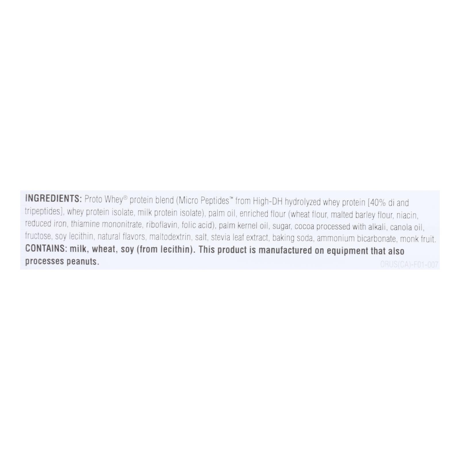 Proto whey protein blend (micro peptides from high-dh hydrolyzed whey protein, whey protein isolate, milk protein isolate); palm oil; enriched flour (wheat flour, malted barley flour, niacin, reduced iron, thiamine mononitrate, riboflavin, folic acid); palm kernel oil; sugar; cocoa processed with alkali; canola oil; fructose; soy lecithin; natural flavors; maltodextrin; salt; stevia leaf extract; baking soda; ammonium bicarbonate; monk fruit.