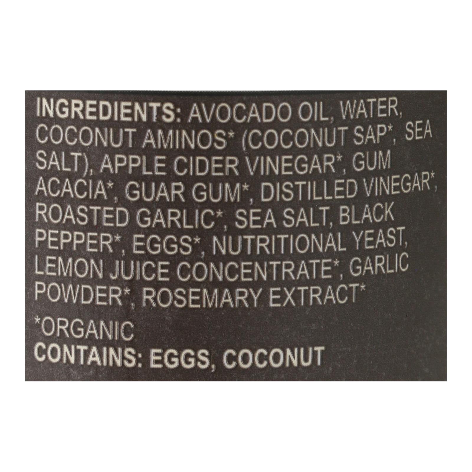 Avocado oil, water, organic vinegar, organic apple cider vinegar, organic egg yolks, organic coconut aminos (water, organic coconut nectar, salt), garlic, potato starch, sea salt, organic black pepper, nutritional yeast, organic lemon juice concentrate, citric acid, salt, tamarind seed gum, mushroom extract (to maintain freshness), organic rosemary extract.