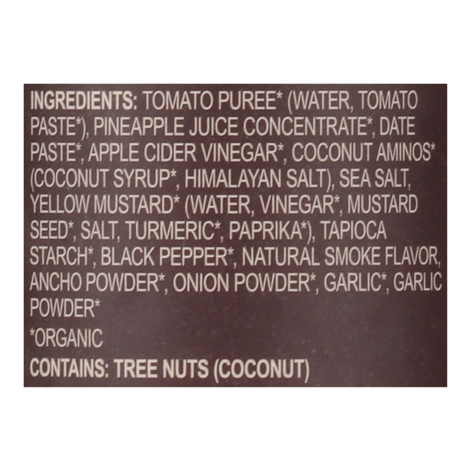 ingredients : tomato puree;water;tomato paste;pineapple juice concentrate;date paste;apple cider vinegar;coconut aminos;coconut syrup;himalayan salt;sea salt;yellow mustard;vinegar;mustard seed;salt;turmeric;paprika;tapioca starch;black pepper;natural smoke flavor;ancho powder;onion powder;garlic;garlic powder
