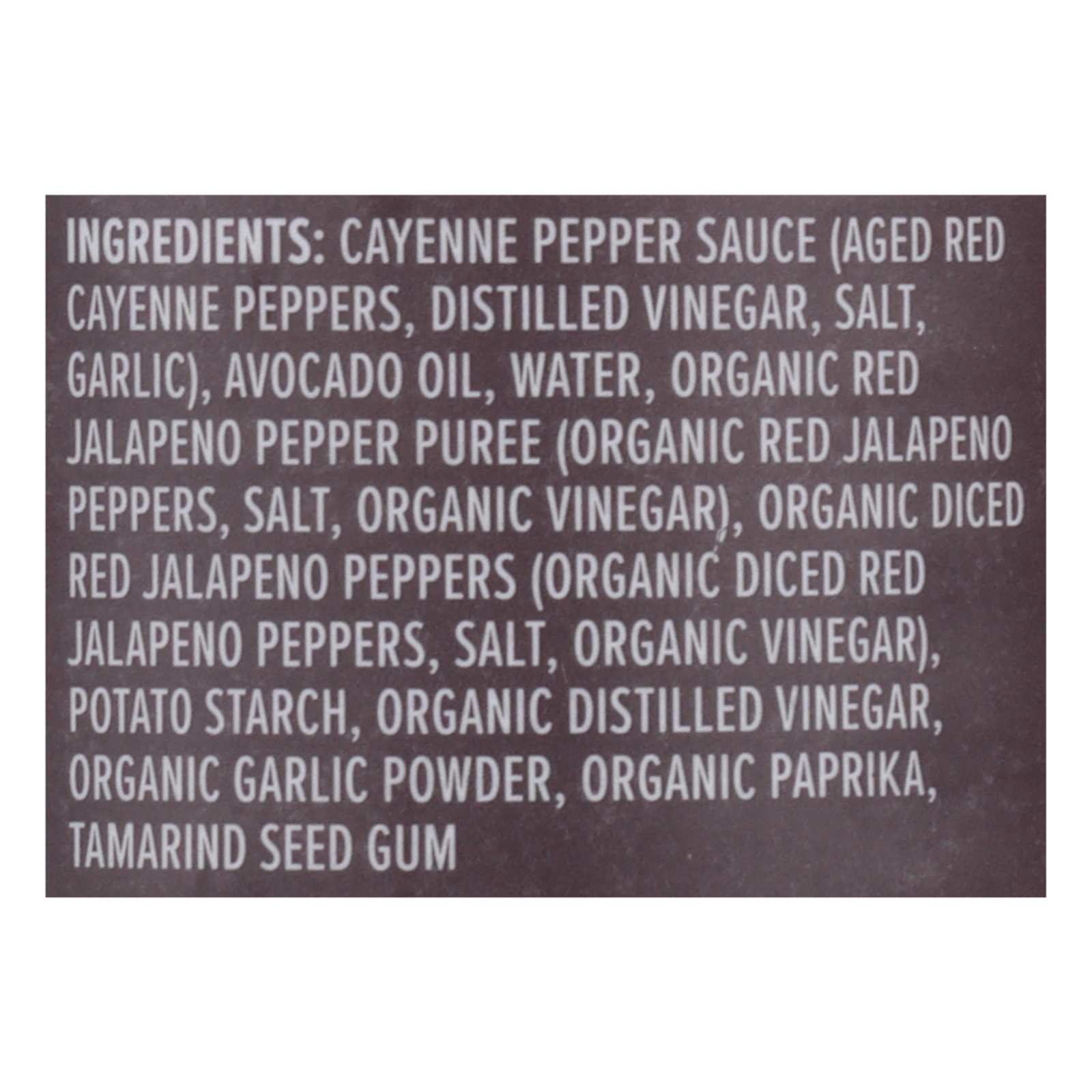 ingredients : cayenne pepper sauce (aged red cayenne peppers, distilled vinegar, salt, garlic);avocado oil;water;organic red jalapeno pepper puree (organic red jalapeno peppers, salt, organic vinegar);organic diced red jalapeno peppers (organic diced red jalapeno peppers, salt, organic vinegar);potato starch;organic distilled vinegar;organic garlic powder;organic paprika;tamarind seed gum